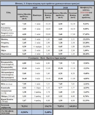 Το κόστος του τραπεζιού τα φετινά Χριστούγεννα είναι αυξημένο κατά 3,68% σε σχέση με την αντίστοιχη περυσινή περίοδο, με ταυτόχρονη ωστόσο υποχώρηση του μοναδιαίου κόστους των προϊόντων κατά 0,96%. Πιο συγκεκριμένα, το χριστουγεννιάτικο οικογενειακό τραπέζι (6-8 ατόμων) θα κοστίσει φέτος 154,57 € έναντι 149,09 € που κόστιζε πέρυσι τα Χριστούγεννα, ενώ αντίθετα το κόστος ανά μονάδα προϊόντων εμφανίζεται μειωμένο από τα 79,05 € το 2018 στα 78,29 € φέτος. Η αύξηση της μέσης τιμής των κρεάτων κατά 11,36% επιδρά καταλυτικά στην αύξηση του συνολικού κόστους, καθώς οι καταναλούμενες ποσότητες υπερβαίνουν κατά πολύ εκείνες των υπόλοιπων κατηγοριών που απαρτίζουν το χριστουγεννιάτικο τραπέζι. Ενδεικτικά αναφέρεται πως οι δαπάνες για αγορά κρεατικών αντιστοιχούν στο 47,6% του συνολικού κόστους του χριστουγεννιάτικου τραπεζιού, αναδεικνύοντας τον αντίκτυπο της φετινής, μέχρι στιγμής, αύξησής τους.