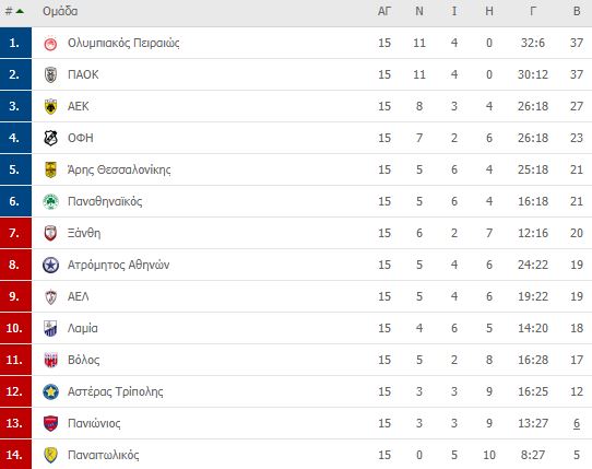 Η βαθμολογία μετά από 15 αγωνιστικές: