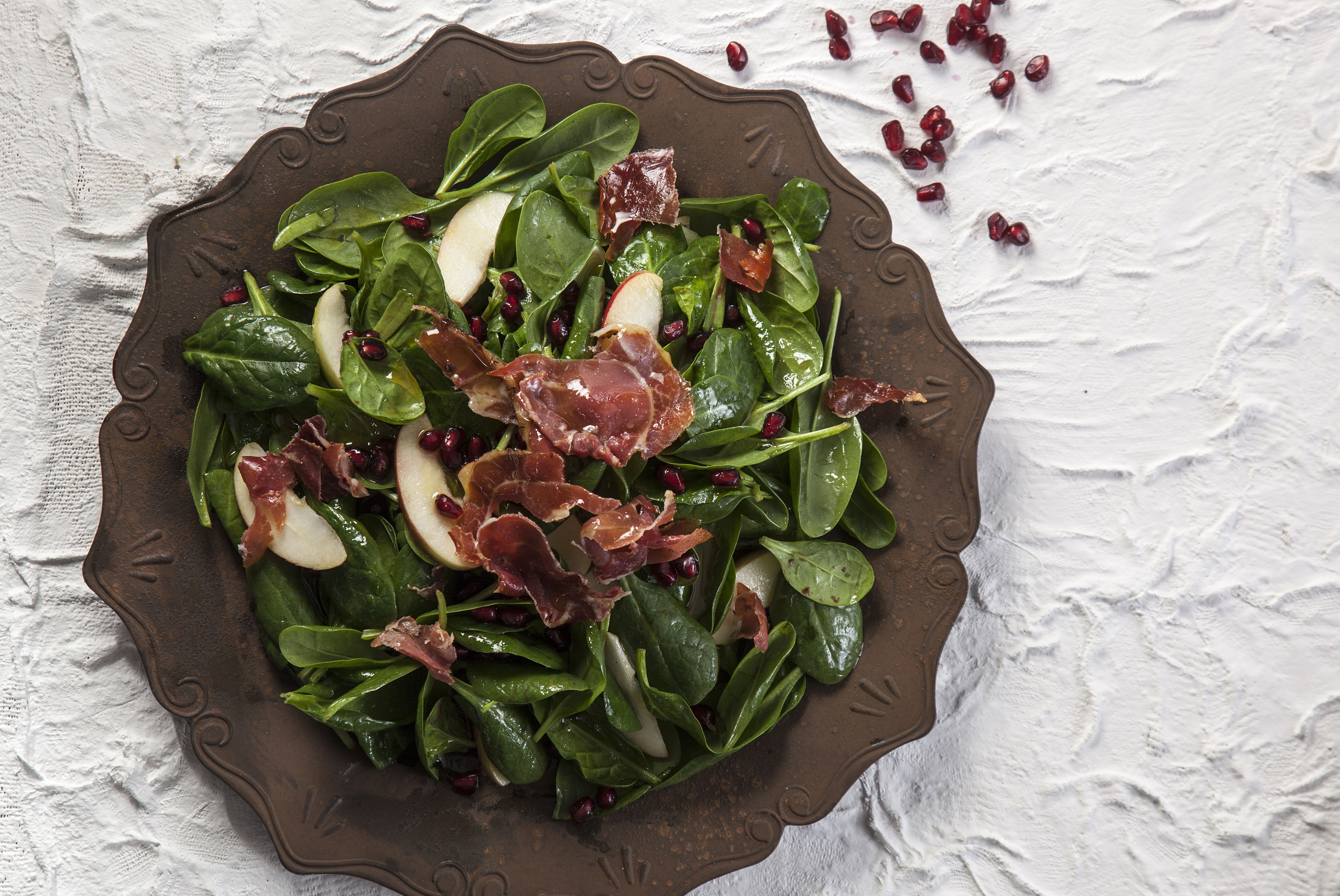 Ρίχνουμε το σπανάκι και τα φιρίκια σε ένα μπολ, τα αλατοπιπερώνουμε και τα περιχύνουμε με το ντρέσινγκ. Ανακατεύουμε καλά. Γαρνίρουμε με το ψημένο προσούτο και τα ρόδια.