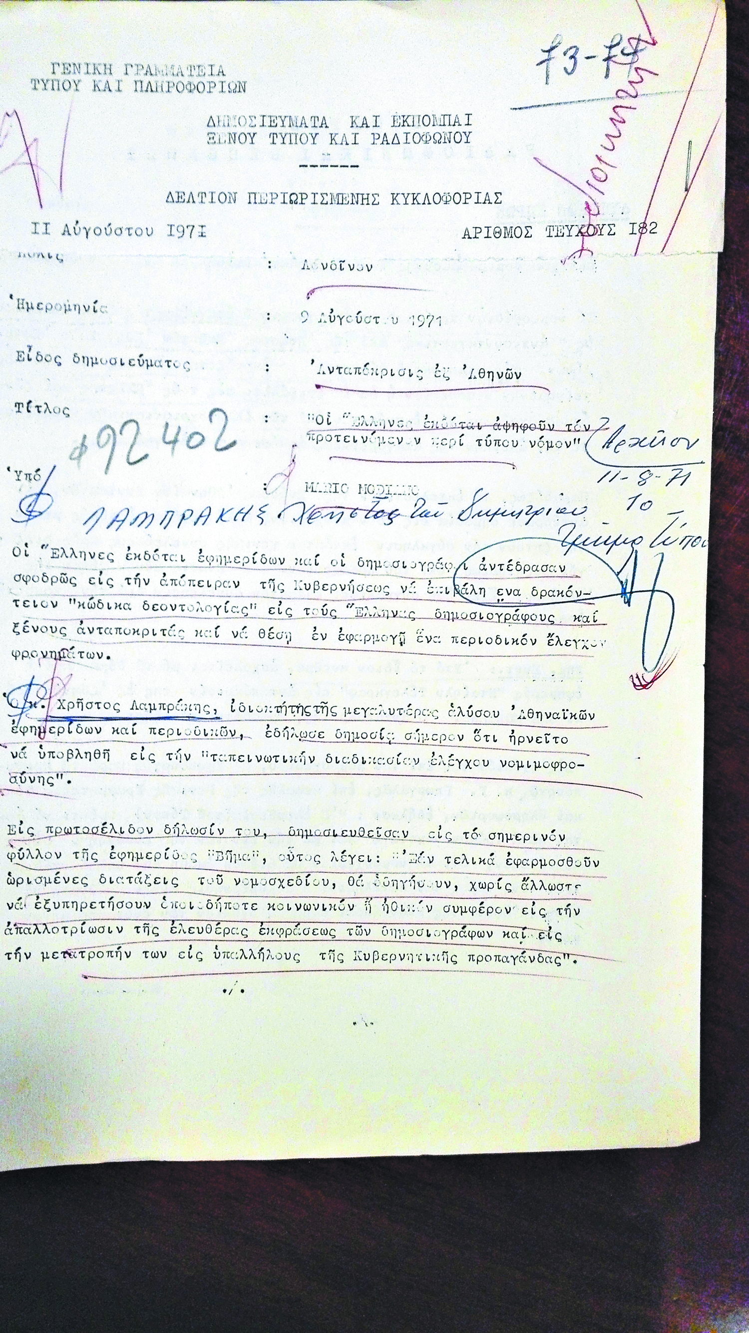 Σε ένα από τα πολλά «σημειώματα» που περιλαμβάνει ο «ατομικός φάκελος» του «Χρήστου Λαμπράκη του Δημητρίου, εκδότη εφημερίδων «ΒΗΜΑ» – «ΝΕΑ»», ο οποίος υπέστη «αποσυμφόρηση» στις 30 Μαΐου 1975, κάτι που σημαίνει ότι μετά την πτώση της χούντας η Ασφάλεια αφαίρεσε από αυτόν τα «επίμαχα» έγγραφα που προφανώς την εξέθεταν ακόμα περισσότερο, περιγράφεται συνοπτικά η μεταχείριση που του επεφύλαξε το καθεστώς των συνταγματαρχών. Σε έγγραφο που συντάχθηκε «αρμοδίως» το 1973 αναφέρονται τα εξής: