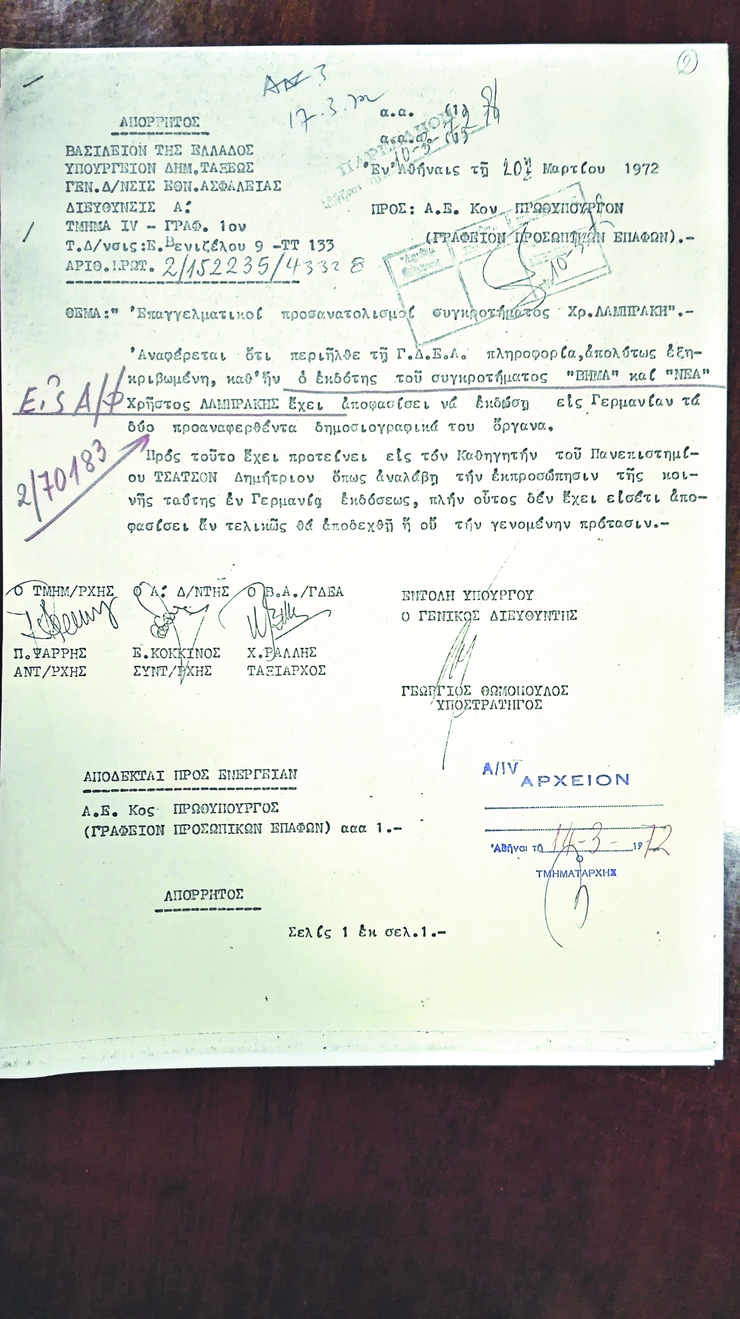 «Θέμα: ΛΑΜΠΡΑΚΗΣ Χρήστος του Δημητρίου και της Ελισσάβετ, γεν. το έτος 1934 εις Αθήνας, κάτοικος Αναγνωστοπούλου 5.