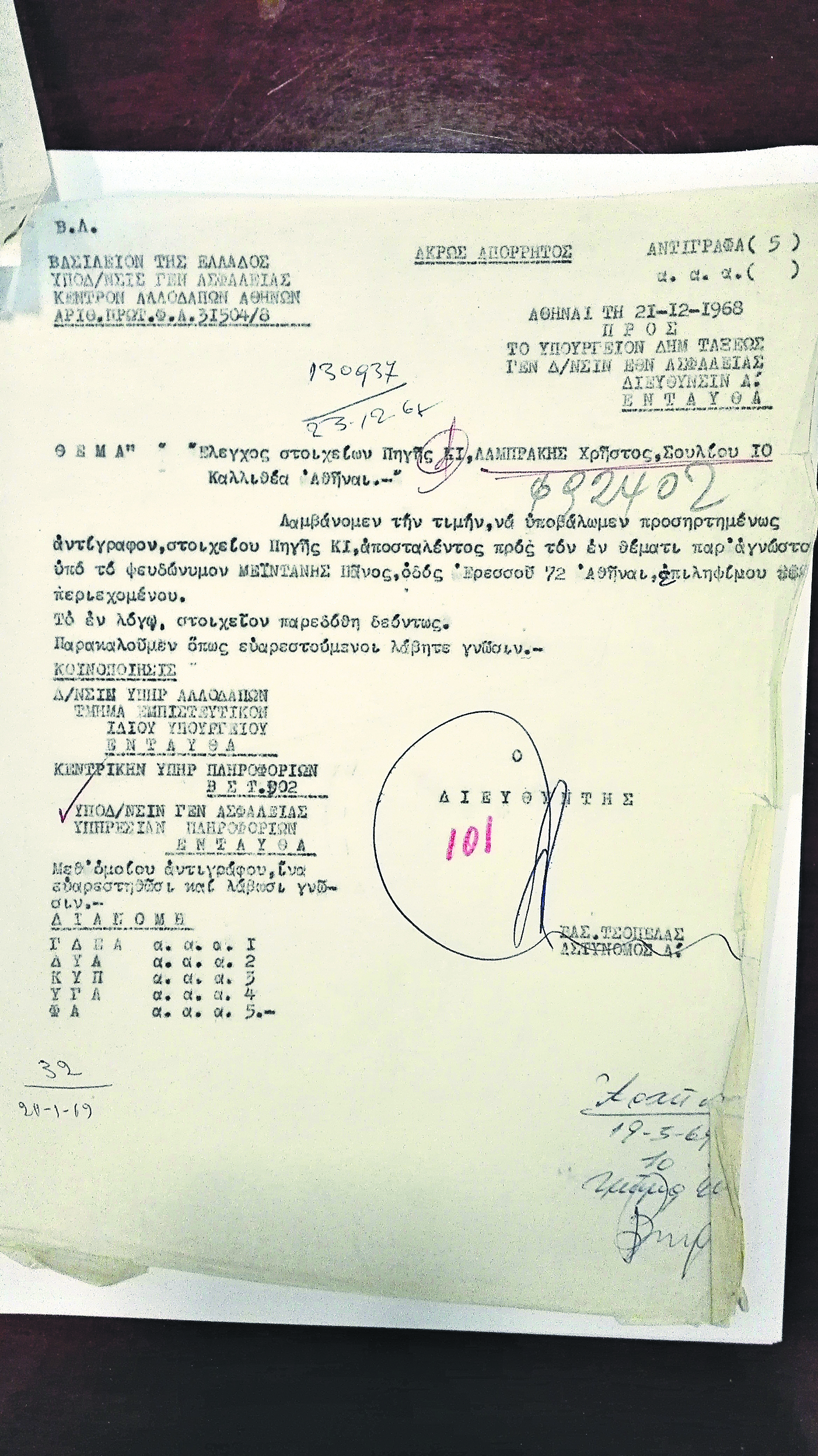 Ενδεικτικό του ασφυκτικού ελέγχου είναι και το «άκρως απόρρητο» έγγραφο της 21ης Δεκεμβρίου 1968 σχετικά με τον «έλεγχο στοιχείων πηγής Κ1» που αφορούσε την αποστολή προς τον εκδότη ενός σημειώματος «παρ’ αγνώστου υπό το ψευδώνυμον ΜΕΪΝΤΑΝΗΣ Πάνος, οδός Ερεσού 72 Αθήναι, επιληψίμου περιεχομένου», το οποίο «παρεδόθη δεόντως», προφανώς στις αρμόδιες αρχές.