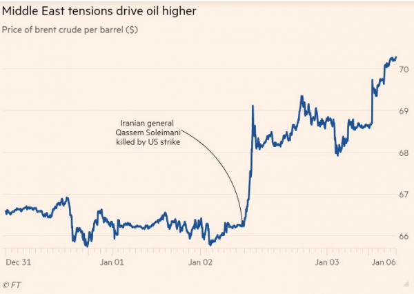 Με άνοδο 2% στις αγορές της Ασίας η τιμή του έφτασε έως τα 70,11 δολάρια, ενώ τα κέρδη υπερβαίνουν το 5% αφότου έγινε γνωστό ότι οι ΗΠΑ δολοφόνησαν τον Κασέμ Σολεϊμανί την Παρασκευή.