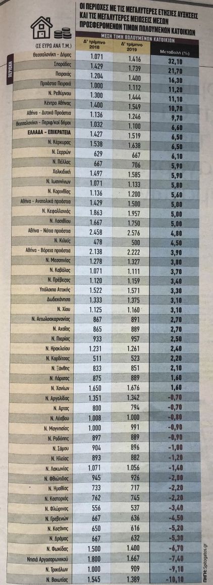 Πρωταθλητής στην αύξηση των εν λόγω τιμών αναδείχθηκε ο Δήμος Θεσσαλονίκης όπου η μέση προσφερόμενη τιμή στα τέλη του 2019 διαμορφώθηκε στα 1.416 ευρώ ανά τετραγωνικό μέτρο όταν το αντίστοιχο διάστημα του 2018 ήταν 1.071 ευρώ το τετραγωνικό μέτρο. Παρουσίασε δηλαδή αύξηση κατά 32,10%. Από κοντά και οι προσφερόμενες κατοικίες στις Σποράδες όπου οι τιμές αυξήθηκαν κατά 21,7% (από 1.429 ευρώ στα τέλη του 2018 σε 1.739 ευρώ στα τέλη του περασμένου έτους).