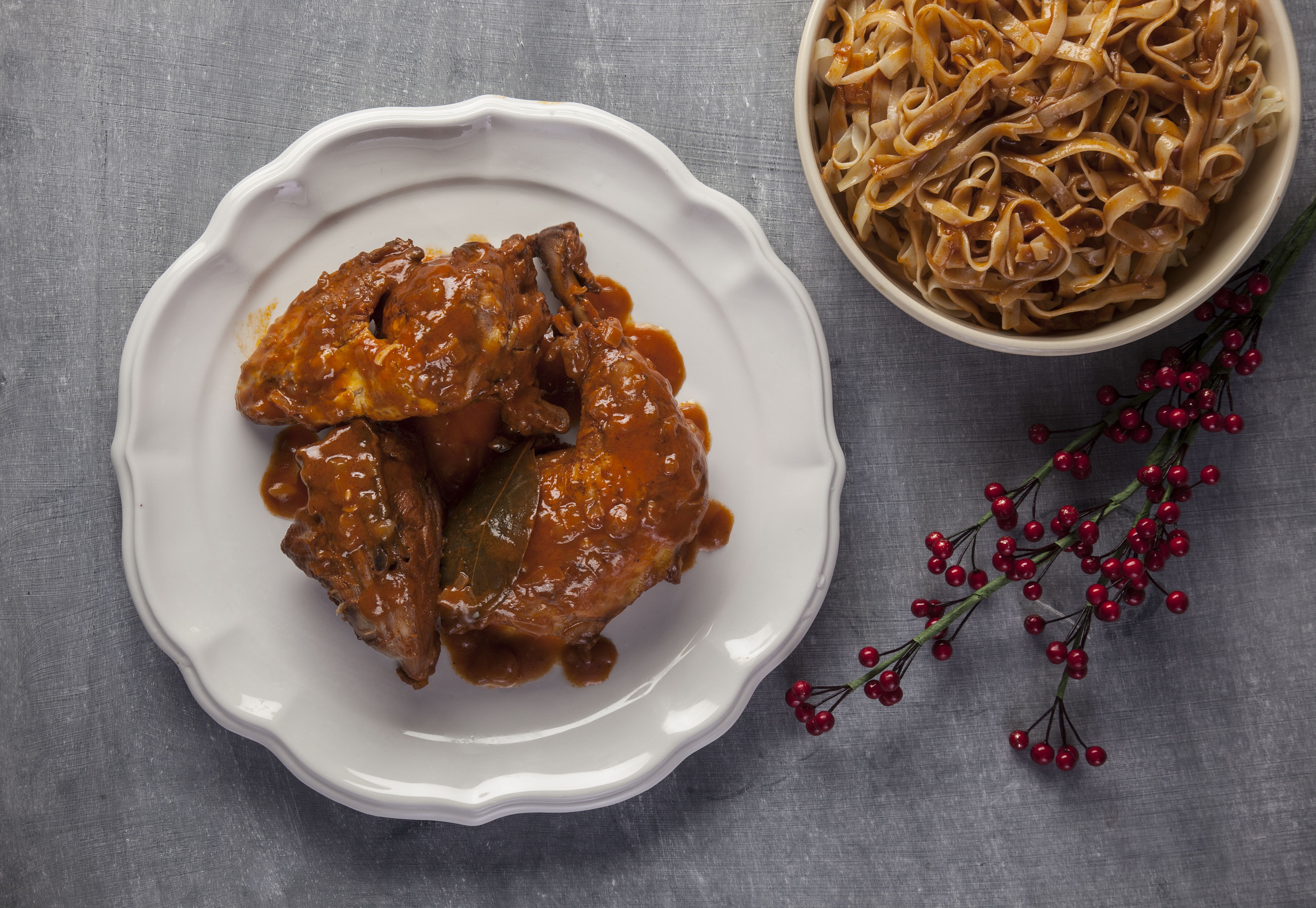 Σε μια άλλη κατσαρόλα ρίχνουμε τα 100 ml ελαιόλαδο, τα ψιλοκομμένα κρεμμύδια και το σκόρδο και τα σοτάρουμε ελαφρά να γυαλίσουν. Προσθέτουμε τα κομμάτια του κόκορα. Σοτάρουμε ελαφρά και προσθέτουμε τον πελτέ. Αλατίζουμε και πιπερώνουμε δίνοντας πολλή προσοχή στο αλάτι. Σβήνουμε με το κόκκινο κρασί, προσθέτουμε την υπόλοιπη δάφνη και νερό, τόσο που να καλύπτεται το κρέας. Ισως χρειαστεί στο βράσιμο να προσθέσουμε ζεστό νερό. Μόλις πάρει βράση χαμηλώνουμε την ένταση της φωτιάς και αφήνουμε να σιγομαγειρευτεί και να χυλώσει (περίπου 1 ώρα και 15 λεπτά).