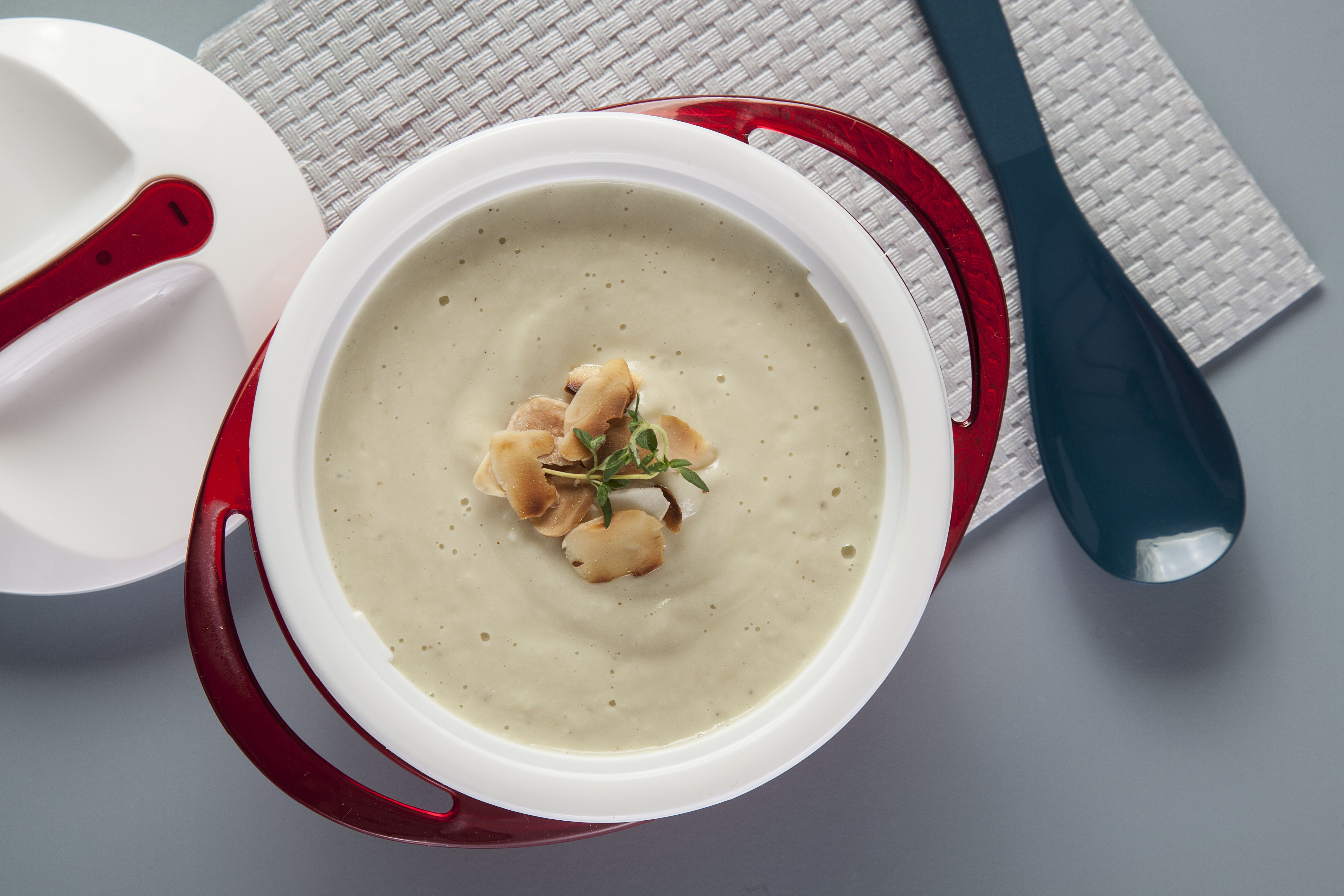 Αν θέλουμε να αραιώσουμε τη σούπα, μπορούμε να προσθέσουμε λίγο ακόμα γάλα αμυγδάλου ή ζωμό.