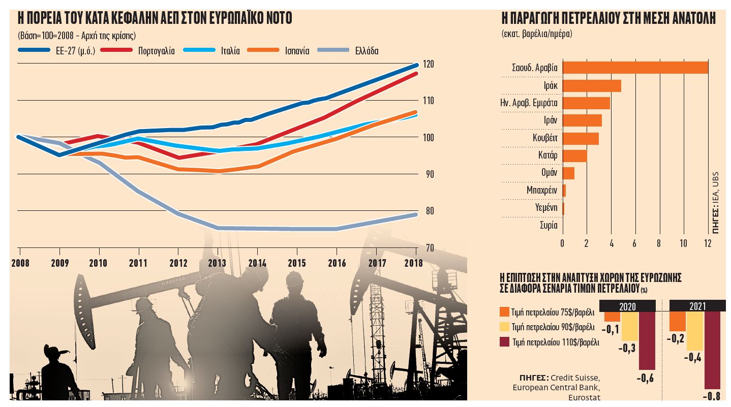 Μια εκτόξευση των τιμών του «μαύρου χρυσού» που θα μπορούσε να οδηγήσει τον κόσμο στα πρόθυρα της ύφεσης δεν θα άφηνε ανεπηρέαστη και την Ελλάδα, το πραγματικό ΑΕΠ της οποίας σημειώνει άνοδο την τελευταία τριετία χάρη στη συμβολή της ιδιωτικής κατανάλωσης και των καθαρών εξαγωγών, ενώ αναμένεται ισχυροποίηση του ρυθμού μεγέθυνσης στο 2,5% εφέτος. Η επενδυτική δαπάνη αναμένεται μάλιστα να ενισχυθεί σημαντικά στο διάστημα 2020-2021 αποτελώντας τον βασικό μοχλό επέκτασης της οικονομικής δραστηριότητας ώστε να κερδηθεί μέρος των απωλειών της κρίσης.