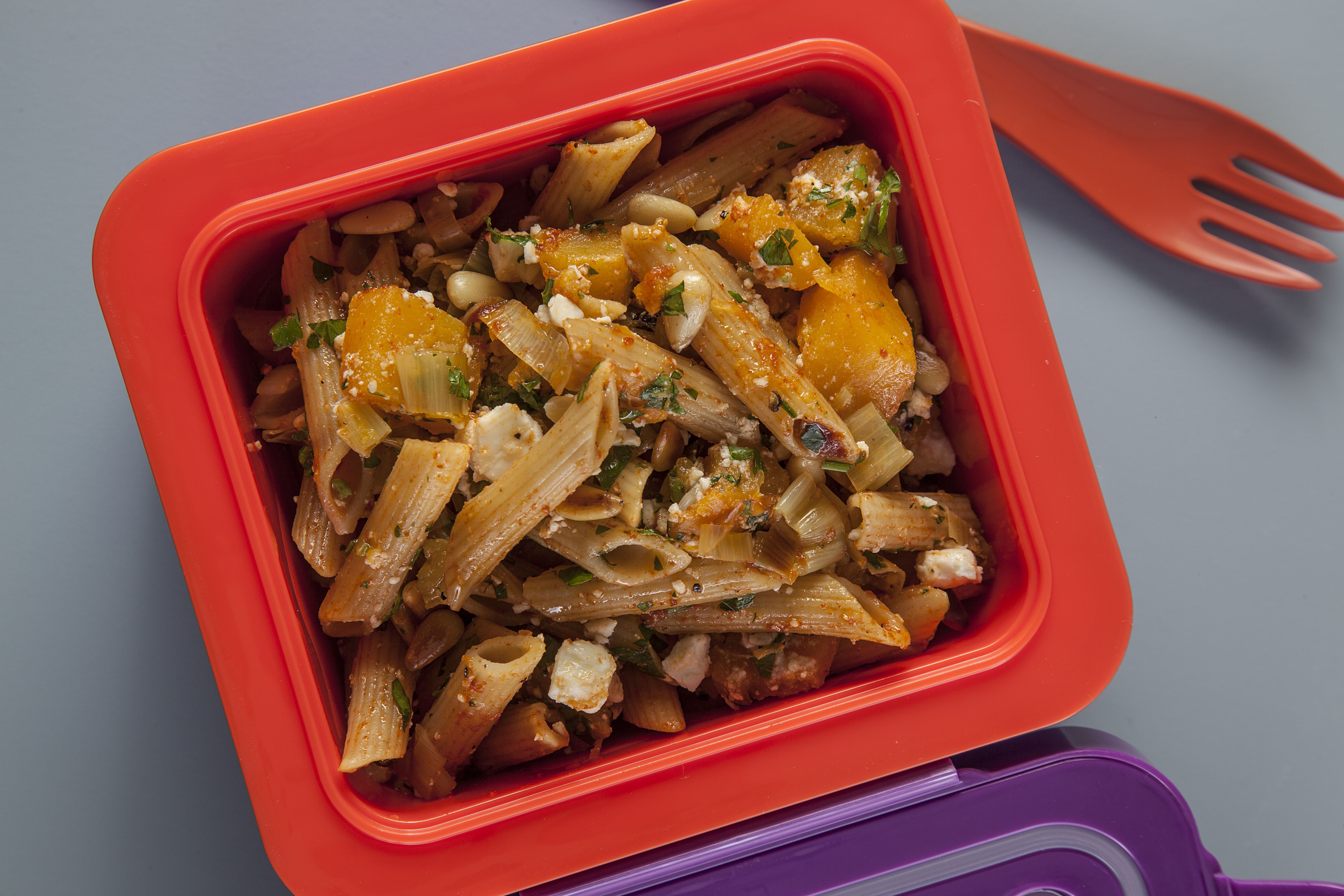 Προσθέτουμε το ντρέσινγκ στις πένες και ανακατεύουμε καλά. Στη συνέχεια, βάζουμε και το πράσο και την κολοκύθα και ανακατεύουμε ελαφρά. Τέλος, προσθέτουμε τη φέτα, τον μαϊντανό και το κουκουνάρι και ανακατεύουμε ξανά απαλά. Η σαλάτα τρώγεται ζεστή ή κρύα.