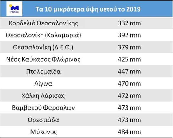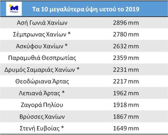 Όπως φαίνεται στον πίνακα, τα μεγαλύτερα ετήσια ύψη βροχόπτωσης το 2019, καταγράφηκαν κατά σειρά στην Ασή Γωνία Χανίων (2.896 χιλιοστά), στο Σέμπρωνα Χανίων (2.780), στο Ασκύφου Χανίων (2.632), στην Παραμυθιά Θεσπρωτίας (2.359), στο Δρυμό Σαμαριάς Χανίων (2.231) και στα Θεοδώριανα ‘Αρτας (2.217 χιλιοστά).