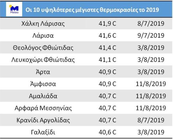 Οι υψηλότερες μέγιστες θερμοκρασίες το 2019 σημειώθηκαν στη Χάλκη Λάρισας (41,9 βαθμοί στις 8/7), στη Λάρισα (41,6 στις 9/7) και στο Θεολόγο Φθιώτιδας (41,4 στις 3/8).