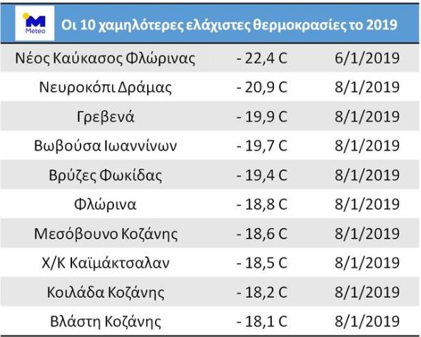 Οι χαμηλότερες ελάχιστες θερμοκρασίες καταγράφηκαν σε Νέο Καύκασο Φλώρινας (μείον 22,5 στις 6/1), Νευροκόπι (μείον 20,9 στις 8/1) και Γρεβενά (μείον 19,9 στις 8/1).