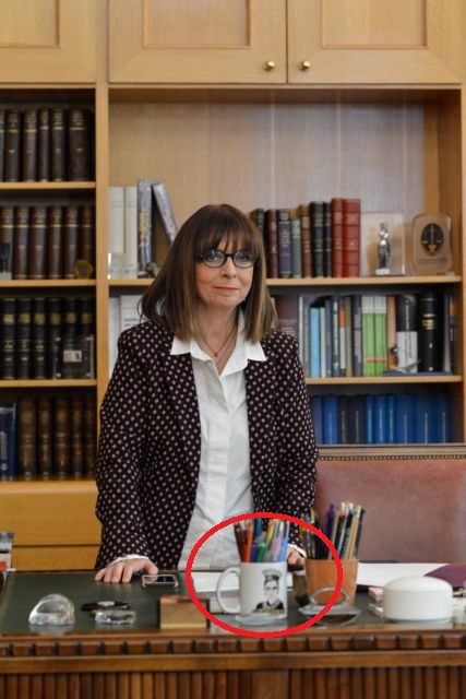 Σε περίοπτη θέση στο γραφείο της Αικατερίνης Σακελλαροπούλου βρίσκεται μια κούπα, που έχει τη φωτογραφία μιας γυναίκας.