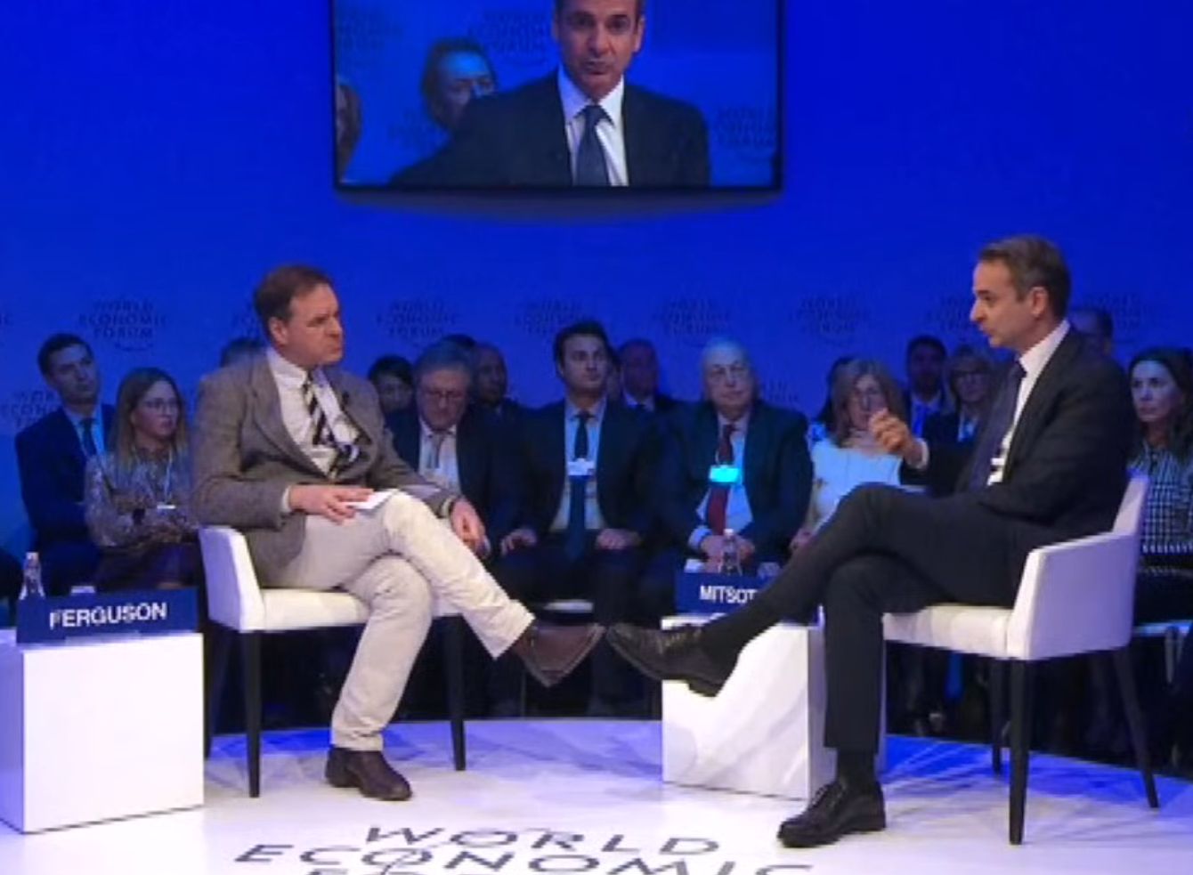 Συζήτηση, παρουσία κοινού, έχει αυτήν την ώρα ο πρωθυπουργός, Κυριάκος Μητσοτάκης, με τον καθηγητή Ιστορίας των Πανεπιστημίων Harvard και Stanford, Niall Ferguson, στο Νταβός.
