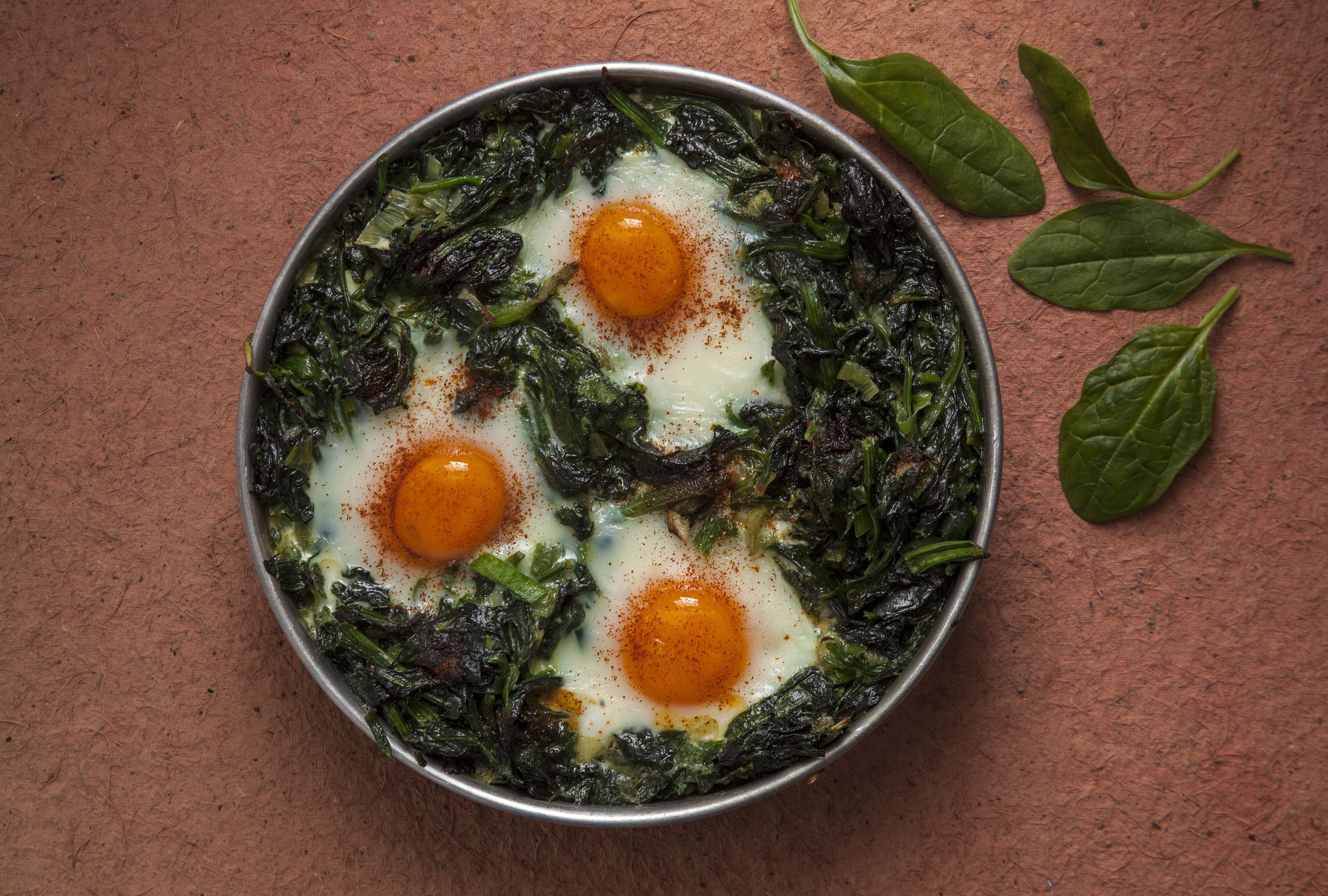 Σοτάρουμε σε ένα μεγάλο τηγάνι με το ελαιόλαδο τα κρεμμύδια. Προσθέτουμε το σπανάκι και χαμηλώνουμε τη φωτιά. Σιγομαγειρεύουμε να βγάλει το σπανάκι τα υγρά του. Προσθέτουμε το λεμόνι, τον άνηθο, αλάτι και πιπέρι. Οταν μαλακώσει το σπανάκι, το μαζεύουμε σε 4 φωλιές. Σπάμε από ένα αβγό σε κάθε φωλιά και σκεπάζουμε το τηγάνι με ένα καπάκι. Σβήνουμε τη φωτιά και αφήνουμε να σιγοψηθούν όλα μαζί. Σερβίρουμε αμέσως. Αν θέλουμε, πασπαλίζουμε με άνηθο στο πιάτο.