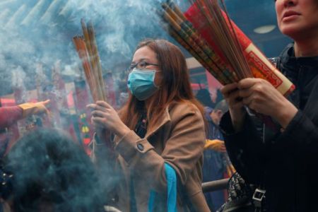 Οι προσκυνητές φορούν μάσκες κατά τη διάρκεια σεληνιακού εορτασμού του Νέου Έτους στο Ναό Τσε Κουνγκ