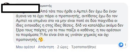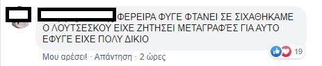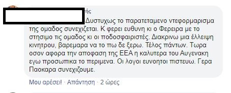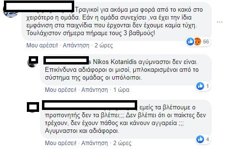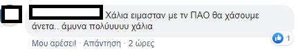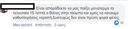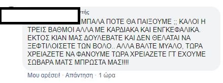 «Δεν το πιστεύω ότι δίνω 5 ευρώ για να δω αυτό το αίσχος», «Φερέιρα φύγε, ο Λουτσέσκου είχε ζητήσει μεταγραφές γι’ αυτό έφυγε. Είχε πολύ δίκιο», «Η ομάδα δεν έχει αρχή μέση και τέλος», «χάλια μαύρα, έτσι δεν πας πουθενά», «τραγική εμφάνιση», «Σαββίδη, θέλουμε μεταγραφές», «μπάλα πότε θα παίξουμε;», «απαράδεκτο, μας έπαιζε μονότερμα ο Βόλος!», «τραγικοί, δεν έχουμε καμία τύχη», ήταν μερικά από τα σχόλια που έγραψαν οι οπαδοί του Δικεφάλου κάτω από το ποστ του παιχνιδιού!