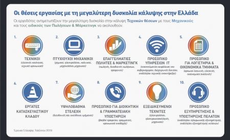 Οι θέσεις των «Τεχνικών» κατέχουν τα πρωτεία στη λίστα καθώς αποτελούν εκείνες με τη μεγαλύτερη δυσκολία κάλυψης στην Ελλάδα και «εκθρονίζουν» τους «Επαγγελματίες Πωλητές», που βρίσκονταν στην 1η θέση από την έναρξη της έρευνας το 2008. Για πρώτη φορά στην κατηγορία των επαγγελματιών Πωλητών προστίθενται και ρόλοι του Marketing όπου μεταφέρονται στην 3η θέση. Στη 2η θέση βρίσκονται οι «Πτυχιούχοι Μηχανικοί» που τοποθετούνταν στην 4η θέση της κατάταξης το 2018.