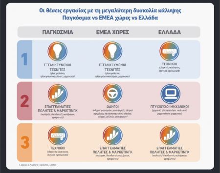 Σε παγκόσμιο επίπεδο αλλά και ανάμεσα στις ΕΜΕΑ χώρες (Ευρώπη, Μέση Ανατολή & Αφρική), στην κορυφή των θέσεων για τις οποίες οι εργοδότες δυσκολεύονται περισσότερο να καλύψουν, βρίσκονται οι «Εξειδικευμένοι Τεχνίτες». Επίσης παρατηρείται πως η θέση των «Επαγγελματιών Πωλητών & Μάρκετινγκ» βρίσκεται εντός τριάδας για την Ελλάδα, τις ΕΜΕΑ χώρες αλλά και παγκόσμια. Στην 3η θέση της παγκόσμιας κατάταξης βρίσκεται η θέση των «Τεχνικών» όπου στην Ελλάδα βρίσκεται στην 1η θέση. Τέλος, την 2η θέση με τη μεγαλύτερη δυσκολία κάλυψης για τις ΕΜΕΑ χώρες καταλαμβάνουν οι «Οδηγοί».