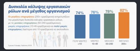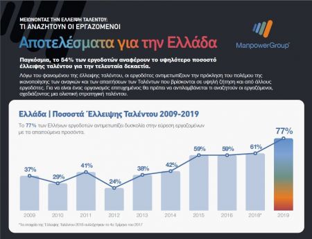 Σχεδόν 8 στους 10 εργοδότες στην Ελλάδα αντιμετωπίζουν δυσκολία στην κάλυψη θέσεων εργασίας, σύμφωνα με τα ευρήματα της Ετήσιας Διεθνούς Έρευνας Έλλειψης Ταλέντου της ManpowerGroup για το 2019. Το ποσοστό 77% αποτελεί ρεκόρ 11ετίας για την Ελλάδα, αφού πρόκειται για το υψηλότερο ποσοστό που έχει καταγραφεί ποτέ από την έναρξη της Έρευνας το 2008 ενώ σημειώνει αύξηση κατά 16 μονάδες σε σύγκριση με το 2018.