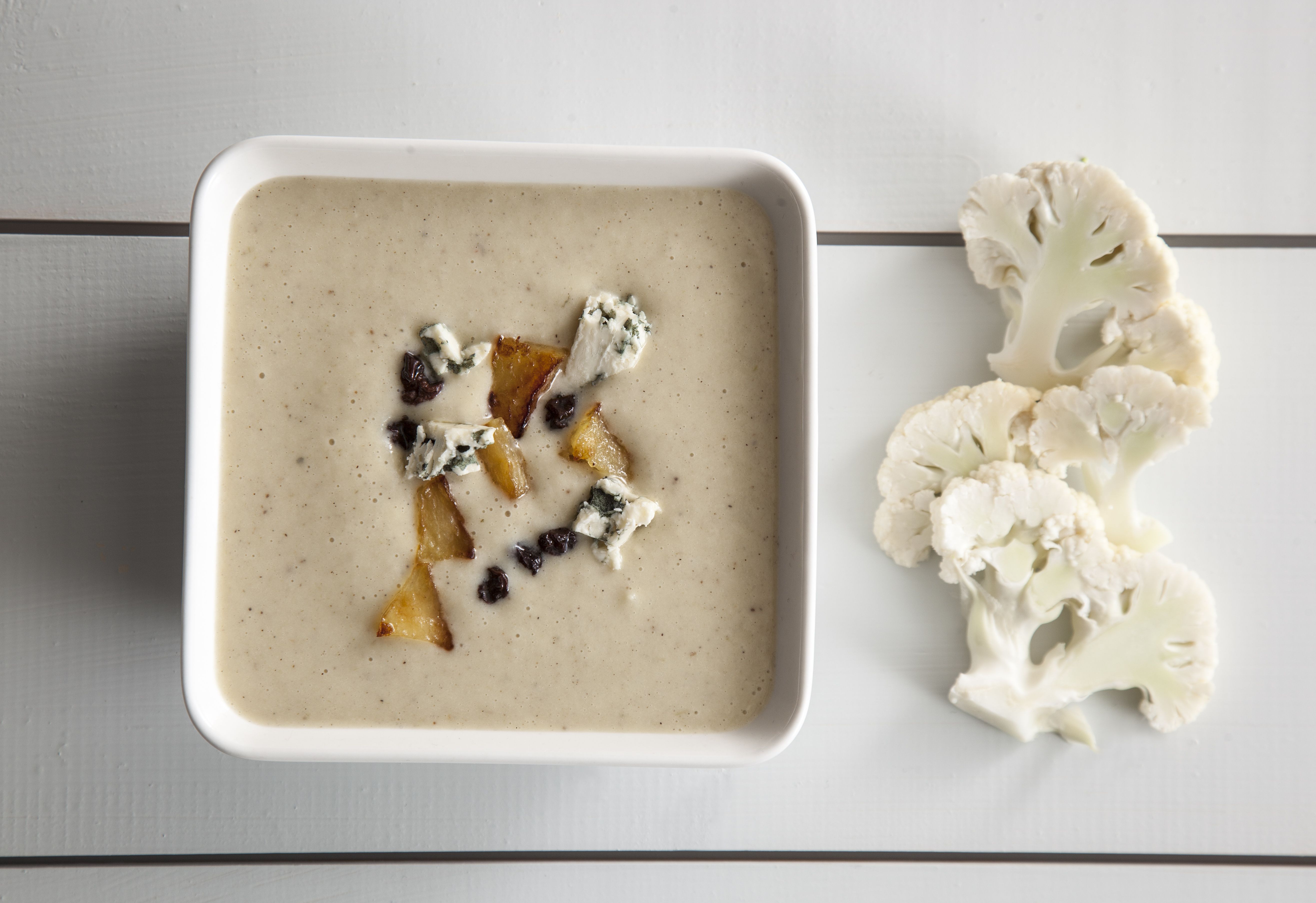 Προσθέτουμε την κρέμα γάλακτος. Χτυπάμε με ένα ραβδομπλέντερ μέχρι να αποκτήσει βελούδινη υφή. Προσθέτουμε το μοσχοκάρυδο και αλάτι κατά βούληση. Σε ένα αντικολλητικό τηγάνι σοτάρουμε με το βούτυρο τα φιρίκια μέχρι να μαλακώσουν (1-2 λεπτά) Σερβίρουμε τη σούπα και γαρνίρουμε με τα φιρίκια, τις σταφίδες και τα κομμάτια ροκφόρ.