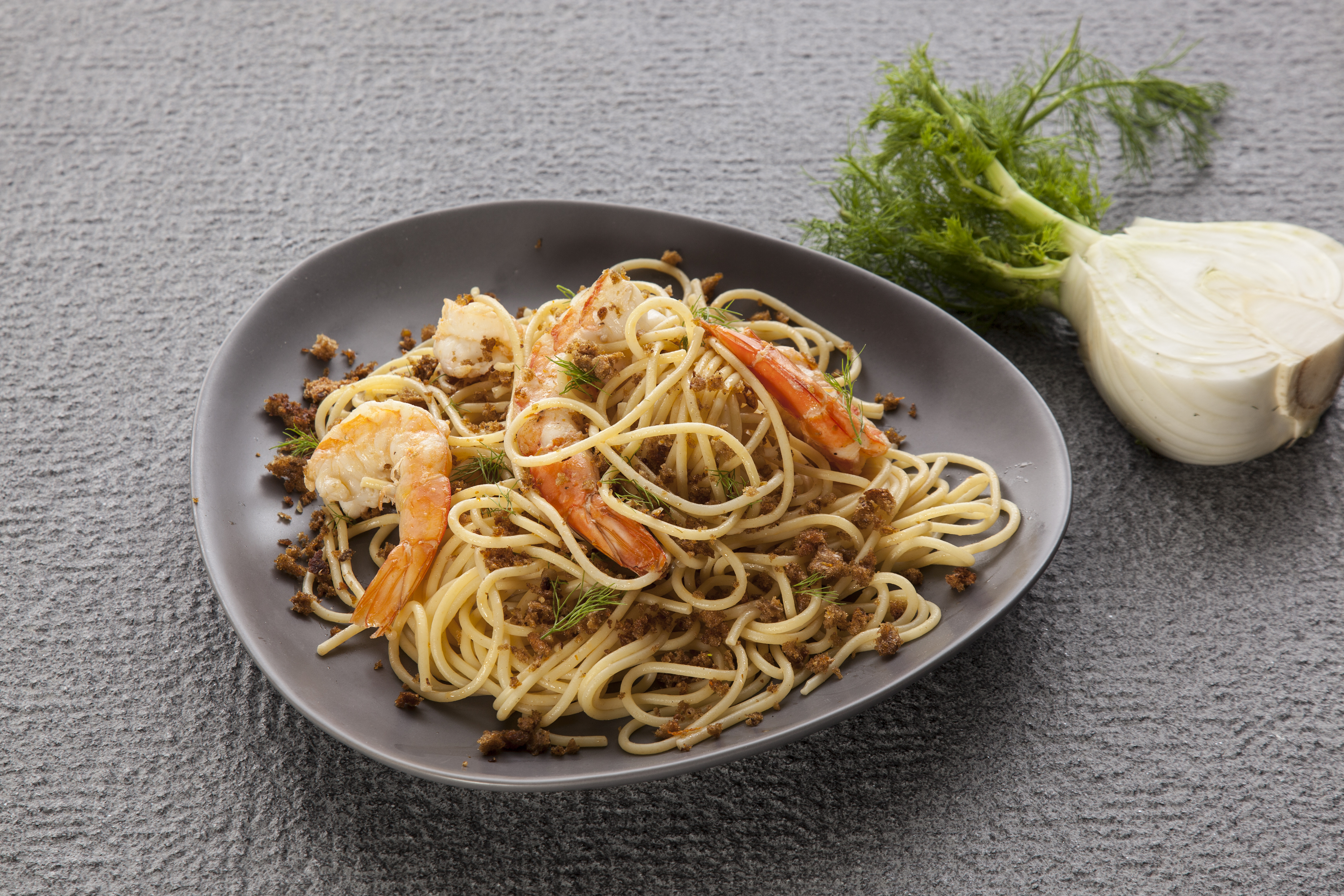 Σοτάρουμε για 5 λεπτά σε μια κατσαρόλα με 50 γρ. ελαιόλαδο τη μαραθόριζα με μία πρέζα αλάτι και λίγο φρεσκοτριμμένο πιπέρι, ανακατεύοντας τακτικά. Παράλληλα, σε ένα τηγάνι ρίχνουμε 50 γρ. ελαιόλαδο και σοτάρουμε, σε δυνατή φωτιά, τα κελύφη με τα κεφάλια των γαρίδων για να αρωματιστεί το λάδι. Μόλις περάσουν τα πέντε λεπτά, ρίχνουμε τον χυμό πορτοκαλιού στη μαραθόριζα. Αφαιρούμε από το τηγάνι τα κελύφη και τα κεφάλια, στραγγίζοντας το περισσότερο δυνατό ελαιόλαδο, και ρίχνουμε μέσα το ψωμί, το ξύσμα πορτοκαλιού και την τριμμένη σκελίδα σκόρδου, να καβουρδιστούν μερικά λεπτά σε μέτρια φωτιά. Μόλις συμπυκνωθεί λίγο ο χυμός στην κατσαρόλα με τη μαραθόριζα, προσθέτουμε τις γαρίδες, τον άνηθο, το μείγμα σκόρδο-αντζούγια, τα σπαγγέτι και μία κουτάλα από το νερό στο οποίο έβρασαν. Συνεχίζουμε το μαγείρεμα ανακατεύοντας συνεχώς να απορροφήσουν τα ζυμαρικά τη γεύση από τον ζωμό και να δέσει η σάλτσα. Διορθώνουμε σε αλάτι και πιπέρι. Σερβίρουμε τα ζυμαρικά σε βαθύ πιάτο, γαρνίρουμε με τις γαρίδες, ραντίζουμε με λίγο ελαιόλαδο και πασπαλίζουμε με το αρωματικό τραγανό ψωμί.