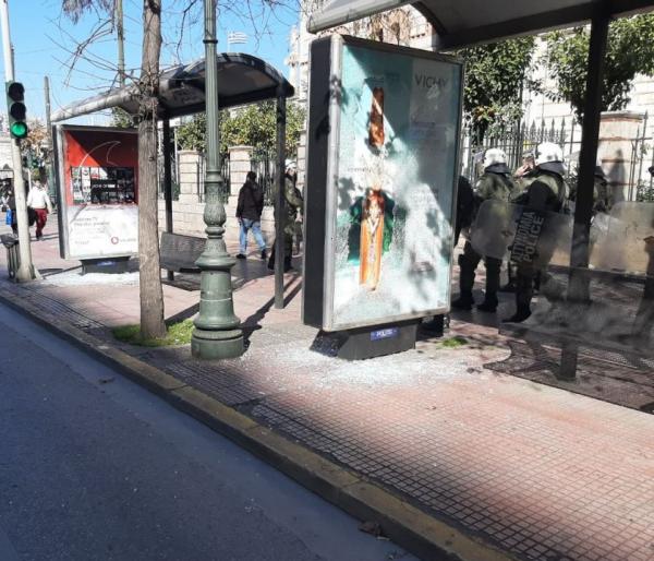 Λίγο πριν την ολοκλήρωση της πορείας, άγνωστοι προκάλεσαν φθορές σε τρεις στάσεις λεωφορείων.