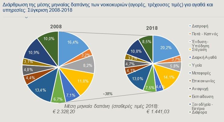 Η στέγαση, η ενέργεια, η διατροφή και η μεταφορά αντιπροσωπεύουν σχεδόν το ήμισυ του μηνιαίου προϋπολογισμού των νοικοκυριών. Η οικονομική κρίση και η συνεπακόλουθη δημοσιονομική προσαρμογή είχαν σαν αποτέλεσμα την απώλεια περίπου του 26% του κατά κεφαλήν ΑΕΠ, από το 2008 έως το 2013. Εξετάζοντας τη σωρευτική μεταβολή της περιόδου 2008-2018, η περικοπή της δαπάνης των νοικοκυριών ήταν αναλογικά μεγαλύτερη (-38%) και συνοδεύτηκε από μία σημαντική μεταβολή στη διάρθρωση των οικογενειακών προϋπολογισμών.