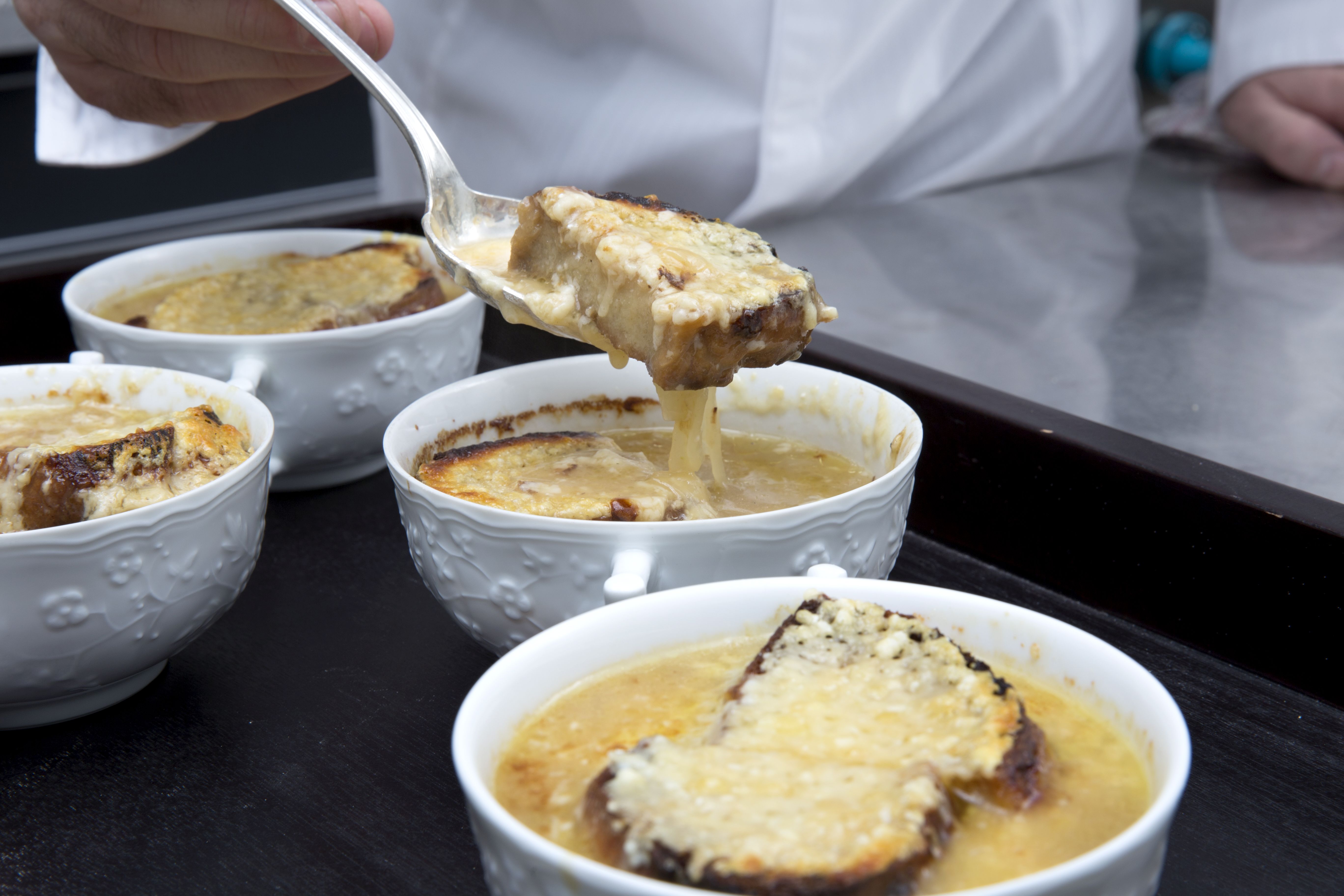 *Στη γαλλική εκδοχή χρησιμοποιούν gruyère (σκληρό, ιδιαίτερα πλούσιο κίτρινο τυρί από μη παστεριωμένο γάλα αγελάδας, από την ομώνυμη περιοχή) ή comté (πολύ παλιό γαλλικό τυρί με μεταξένια ελαστική υφή που φτιάχνεται στο οροπέδιο της περιοχής Massif du Jura από μη παστεριωμένο αγελαδινό γάλα). Για να φέρουμε στα δικά μας τη συνταγή μπορούμε να χρησιμοποιήσουμε μια πικάντικη γραβιέρα, ή ένα σκληρό κατσικίσιο ή και μετσοβόνε – που θα δώσει καπνιστή γεύση στη σούπα μας.