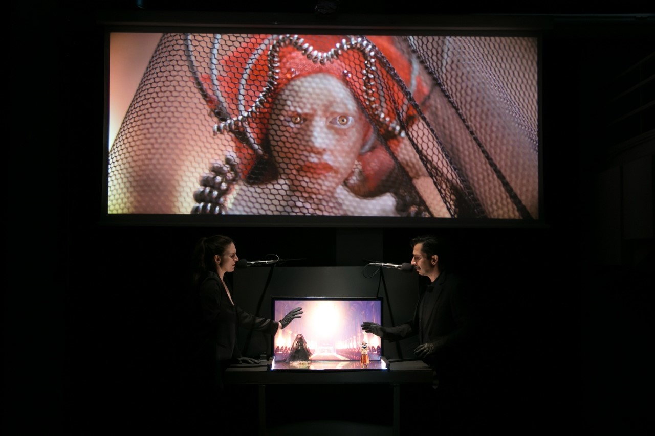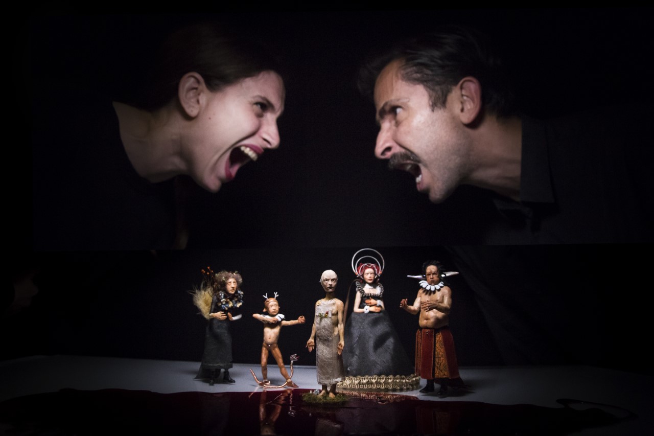 Οι πρωταγωνιστές της παράστασης είναι μικρά γλυπτά, που αναπαριστούν τους ήρωες του έργου. Μέσα από ζωντανό και ηχογραφημένο λόγο, οι ηθοποιοί τούς δίνουν φωνή, παίζοντας ταυτόχρονα μαζί τους. Δύο οθόνες ζωντανεύουν τους σκηνικούς χώρους, προβάλλοντας επεξεργασμένες εικόνες, στατικές και κινούμενες. Μια τρίτη οθόνη αναπαράγει σε παράλληλο χρόνο την ιστορία, χρησιμοποιώντας κοντινά πλάνα στα μικρά γλυπτά, παίζοντας με μοντάζ και οπτικά εφέ.