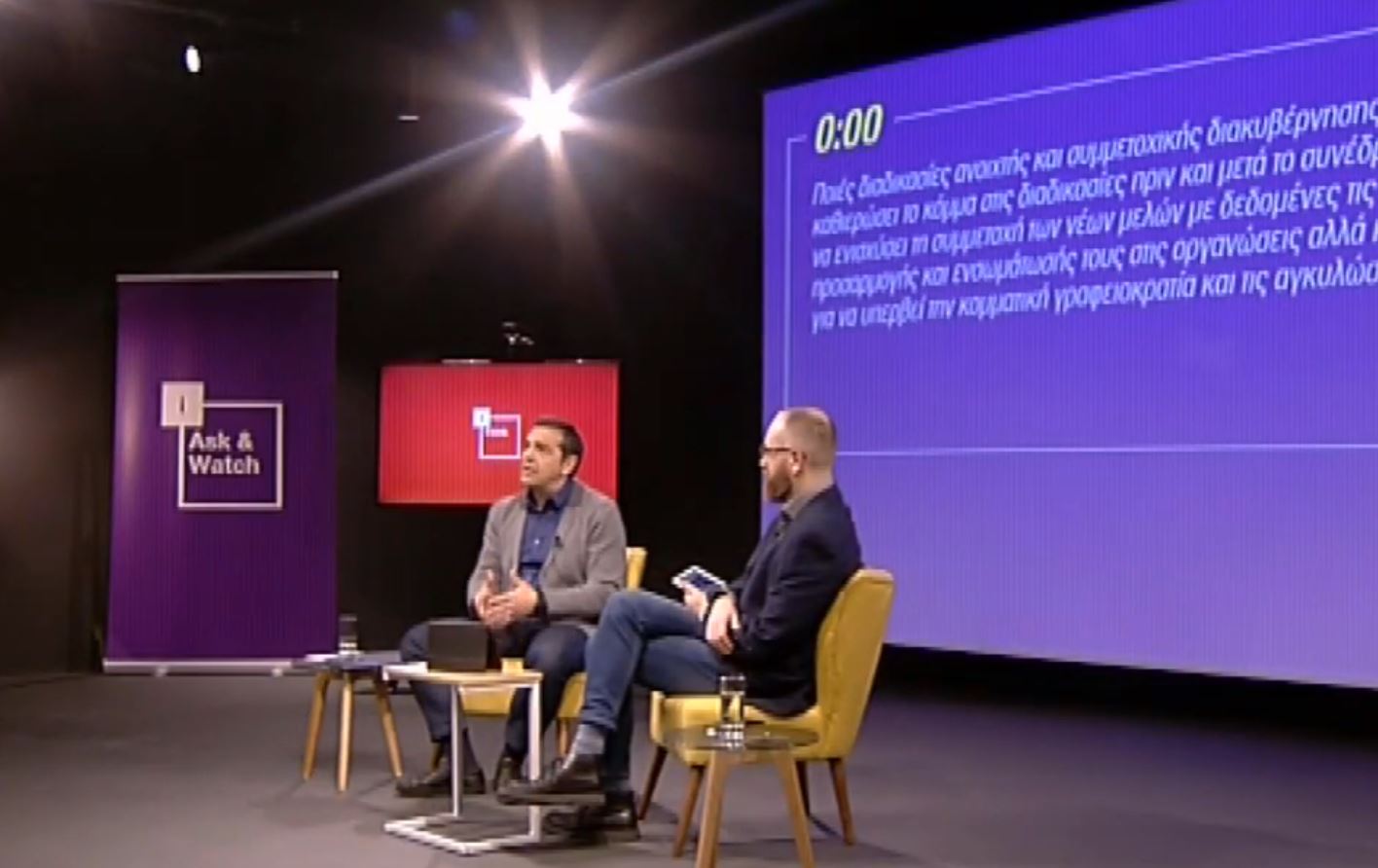 Ο κ. Τσίπρας «μέσω της καινοτόμου λειτουργικότητας του iAsk&Watch απαντά ο ίδιος στα 20 δημοφιλέστερα ερωτήματα των μελών του iSYRIZA, τα οποία ψηφίστηκαν από χιλιάδες μέλη της πλατφόρμας μέσω μιας πρωτοφανούς συμμετοχικής διαδικασίας» σημειώνεται στη σχετική ανακοίνωση του κόμματος.