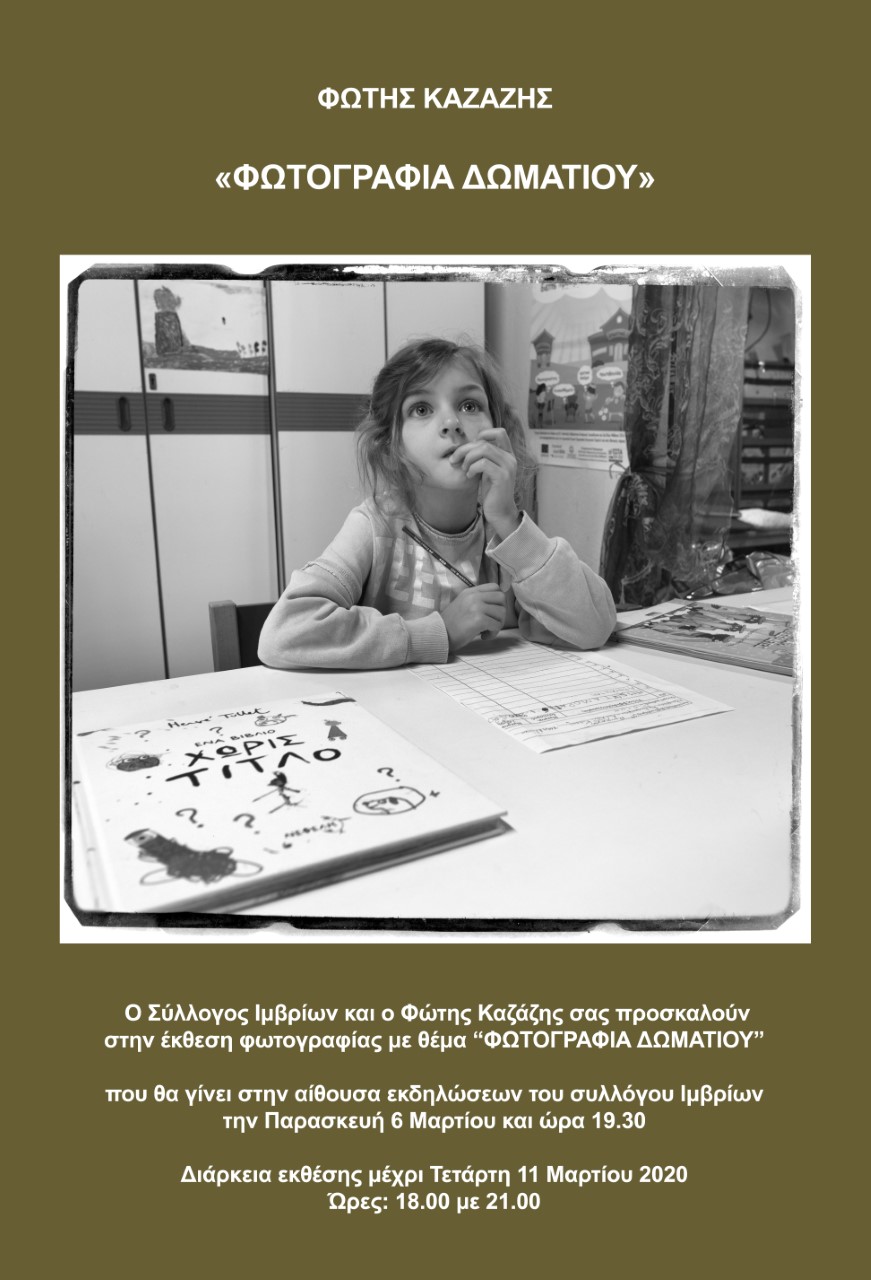 Ανοίγει την Παρασκευή 6 Μαρτίου στις 19.30′ τις πύλες της στην αίθουσα εκδηλώσεων του Συλλόγου Ιμβρίων η έκθεση φωτογραφίας του Φώτη Καζάζη με θέμα «Φωτογραφία Δωματίου».
