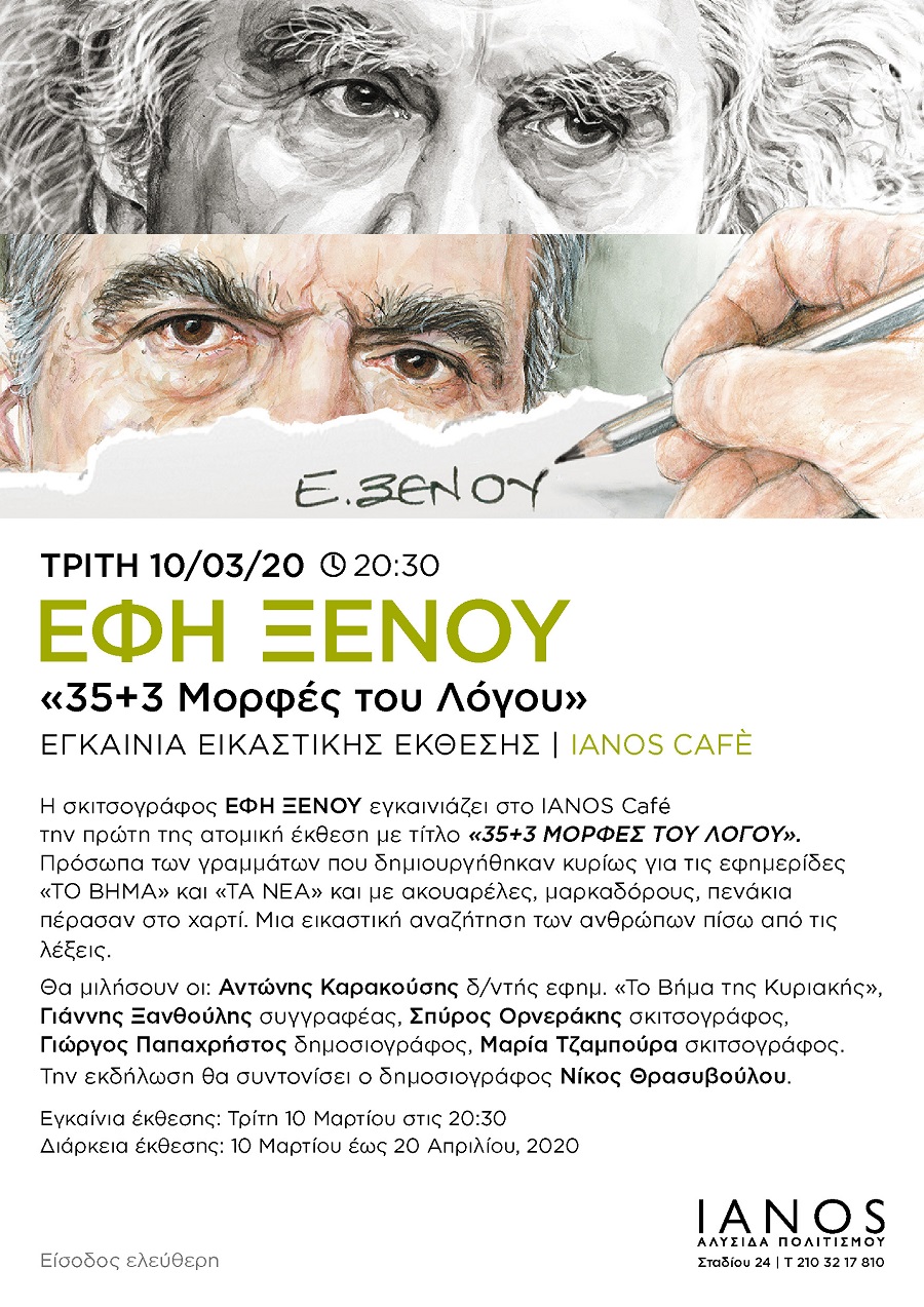 Την Τρίτη 10 Μαρτίου στις 20:30 η σκιτσογράφος Έφη Ξένου εγκαινιάζει στο IANOS Café της Αθήνας την πρώτη της ατομική έκθεση με τίτλο «35+3 Μορφές του Λόγου».