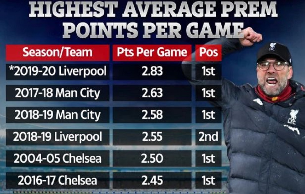 Πίσω από τη φετινή Λίβερπουλ, είναι η Μάντσεστερ Σίτι του 2017-18 με 2,63 πόντους ανά αγώνα, ενώ ακολουθούν στην πρώτη πεντάδα Μάντσεστερ Σίτι (2018-19), Λίβερπουλ (2018-19) και Τσέλσι (2004-05).