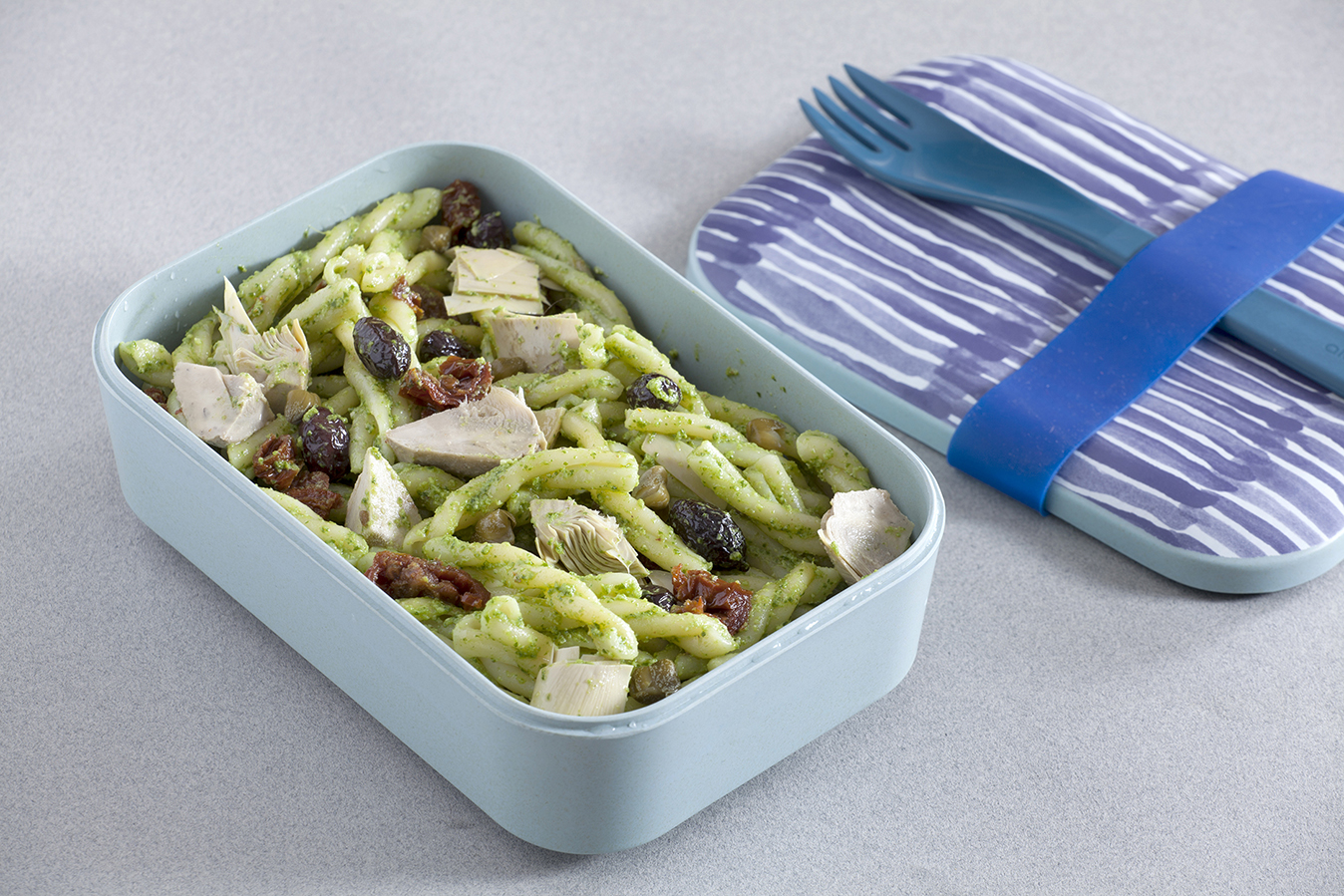 Πέστο. Μπορούμε να το έχουμε ετοιμάσει από την προηγούμενη ημέρα, γιατί διατηρείται τέλεια σε γυάλινο βαζάκι στο ψυγείο για 2-3 ημέρες (αν προσθέσουμε το τυρί την τελευταία στιγμή διατηρείται περισσότερο).