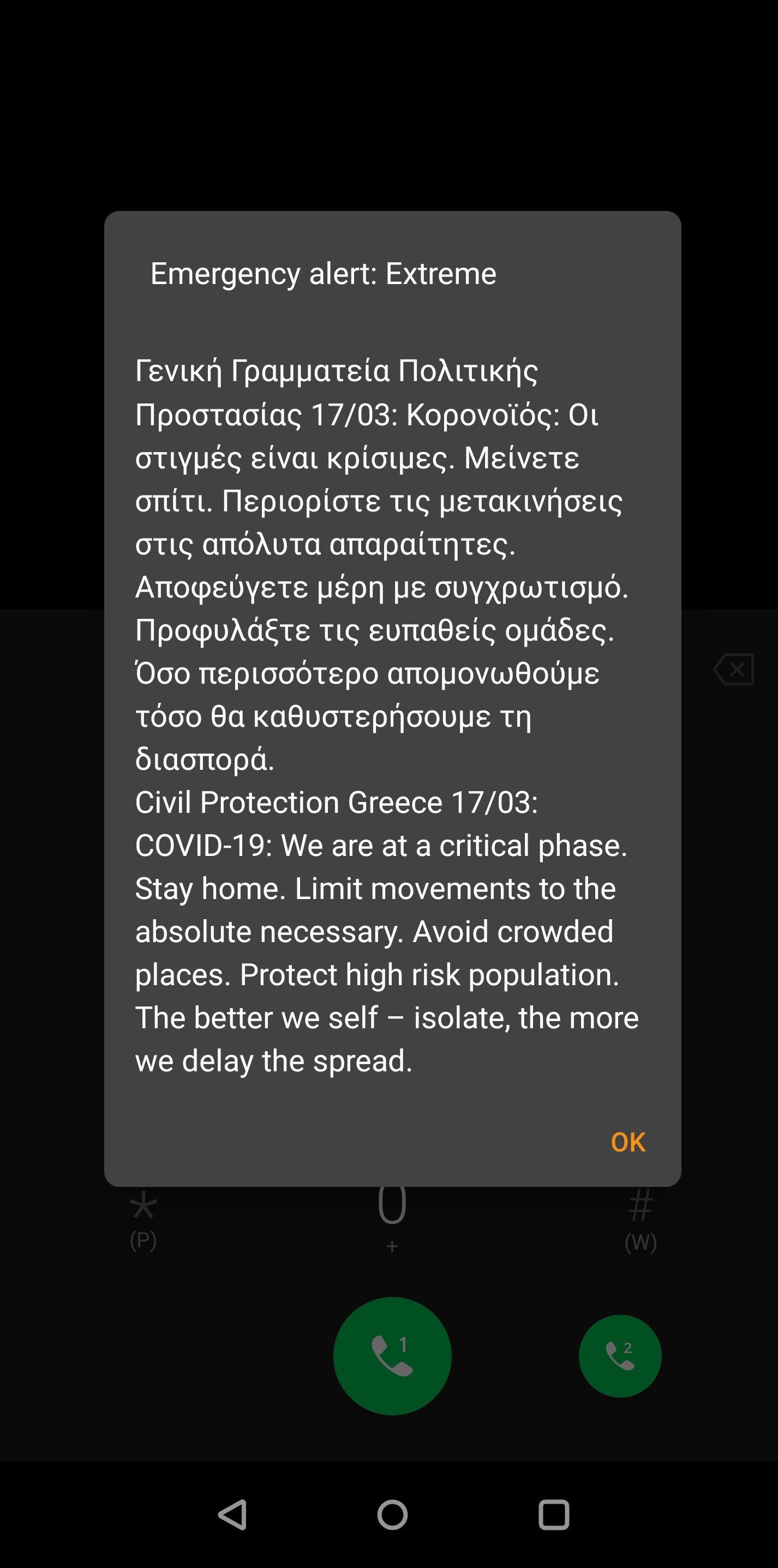 Αναλυτικά, το μήνυμα που είναι γραμμένο στα ελληνικά και στα αγγλικά, αναφέρει: «Γενική Γραμματεία Πολιτικής Προστασίας 17/03: Κορονοϊός: Οι στιγμές είναι κρίσιμες. Μείνετε σπίτι. Περιορίστε τις μετακινήσεις στις απόλυτα απαραίτητες. Αποφεύγετε μέρη με συγχρωτισμό. Προφυλάξτε τις ευπαθείς ομάδες. Όσο περισσότερο απομονωθούμε τόσο θα καθυστερήσουμε την διασπορά».