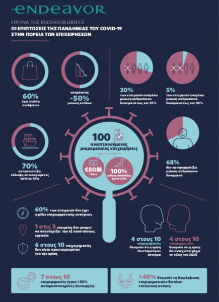 Ανησυχητικές είναι οι μέχρι τώρα επιπτώσεις στην αναπτυσσόμενη επιχειρηματικότητα της χώρας από την έξαρση της πανδημίας του κοροναϊού, σύμφωνα με τη νέα έρευνα της Endeavor Greece αναφορικά με την πορεία των πωλήσεων και της απασχόλησης, την ετοιμότητα των ελληνικών επιχειρήσεων και την ικανότητα προσαρμογής τους στα νέα δεδομένα.