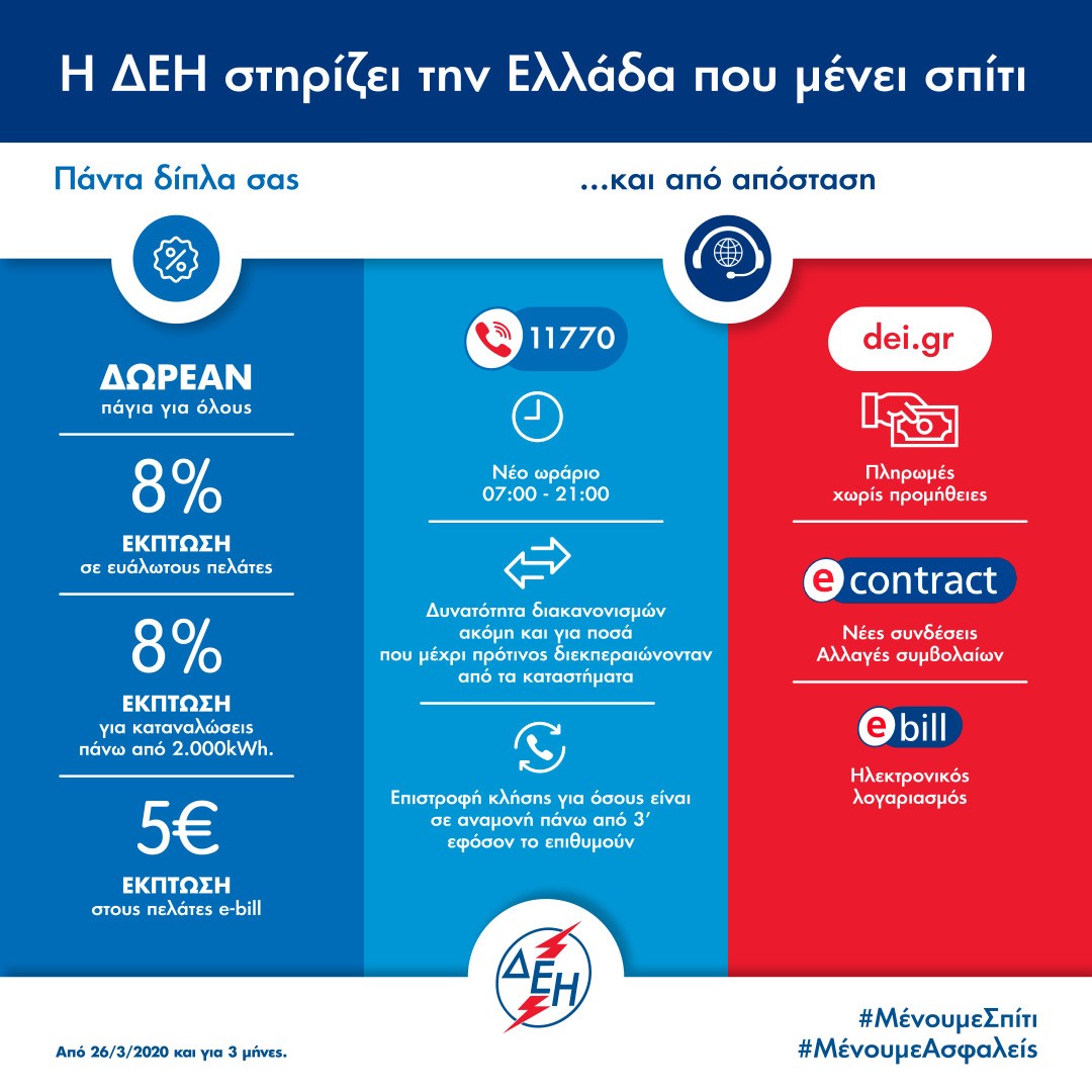 Η ΔΕΗ στέκεται δίπλα στην ελληνική κοινωνία τις δύσκολες ώρες που περνάμε. Βασική της προτεραιότητα είναι η διασφάλιση της ενεργειακής επάρκειας της χώρας και συγχρόνως η στήριξη των καταναλωτών της. Ειδικά αυτή την κρίσιμη περίοδο, που επιβάλλεται η μεγαλύτερη δυνατή παραμονή μας στο σπίτι. Η ΔΕΗ, στο βαθμό των δυνατοτήτων της, προχωρά σε μια σειρά μέτρων οικονομικής ελάφρυνσης των πολιτών. Ενώ παράλληλα, βοηθά όλους τους πελάτες της να πραγματοποιήσουν τις συναλλαγές τους και να εξυπηρετηθούν από το σπίτι τους καλώντας στο τηλεφωνικό κέντρο της ΔΕΗ 11770 ή μέσα από την ιστοσελίδα www.dei.gr.