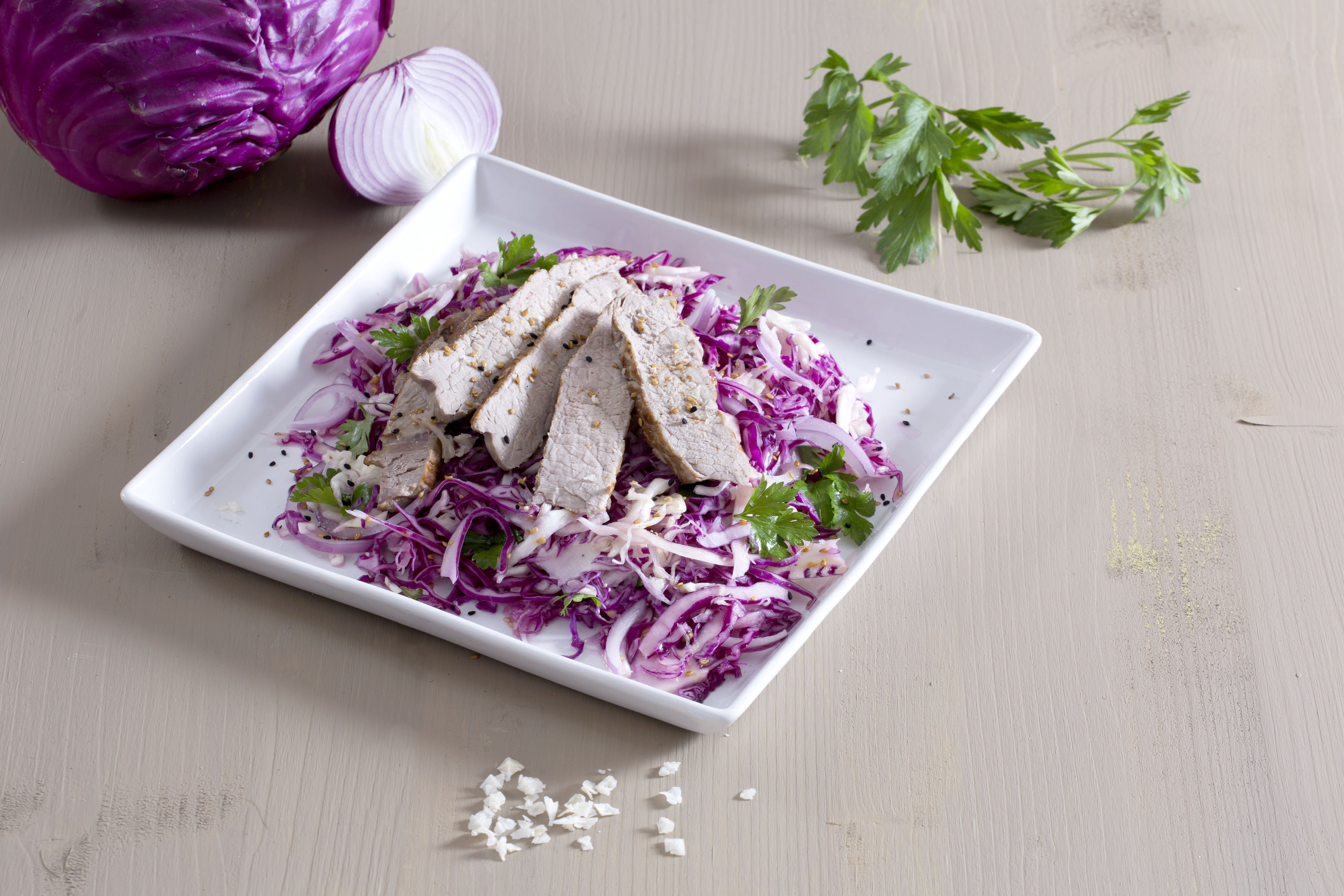 Αποσύρουμε την μπριζόλα από τη φωτιά και την κόβουμε σε φέτες. Τις βάζουμε πάνω από το μαριναρισμένο λάχανο. Ραντίζουμε την μπριζόλα με λίγο αγουρέλαιο, τρίβουμε από πάνω ανθό αλατιού και λίγο μαύρο φρεσκοτριμμένο πιπέρι. Πασπαλίζουμε με λευκό και μαύρο σουσάμι.