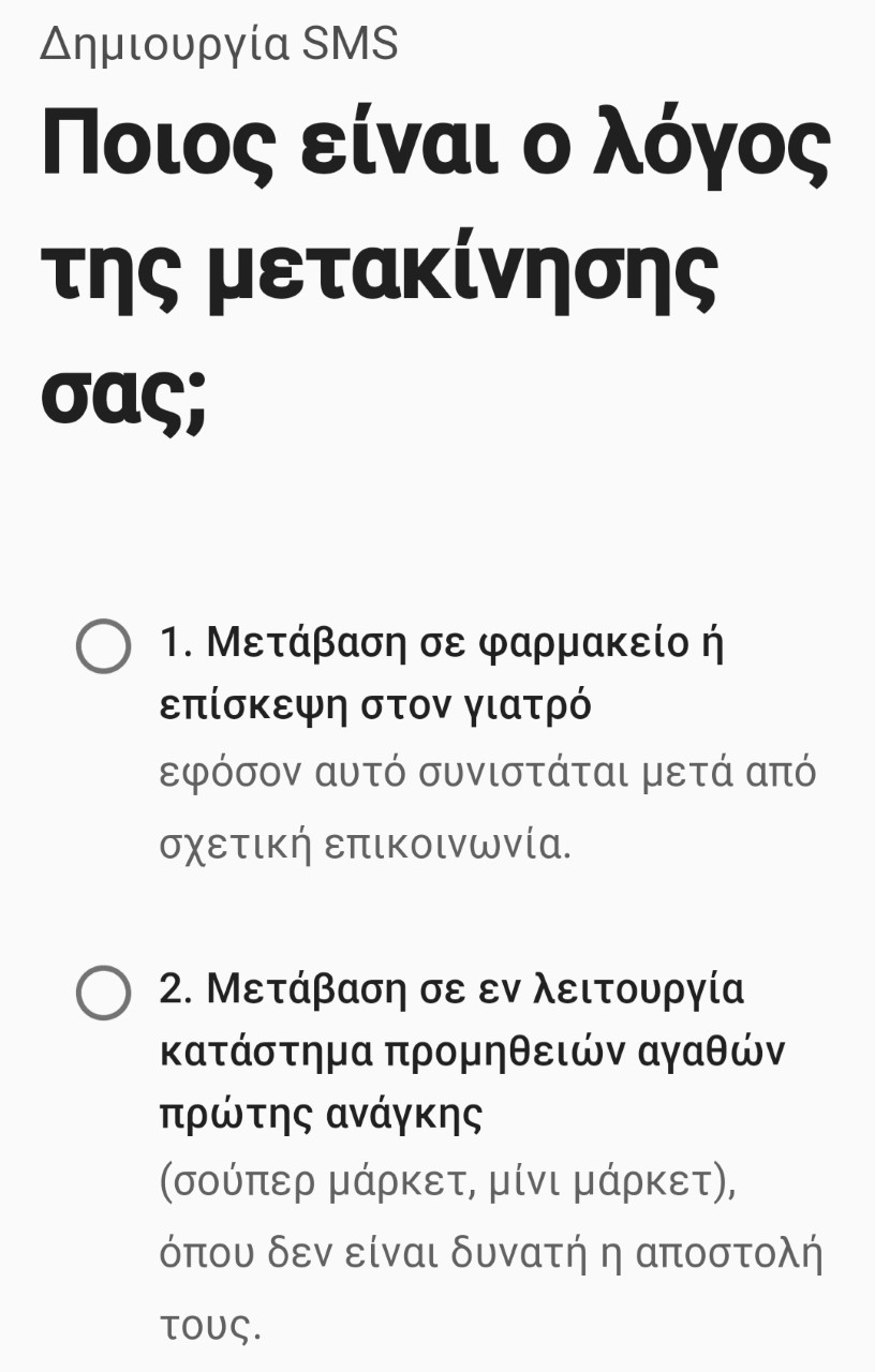 Το Υπουργείο Ψηφιακής Διακυβέρνησης, θέλοντας να κάνει την διαδικασία αυτή ακόμα πιο φιλική για τους πολίτες, ενεργοποίησε από το βράδυ της 24ηςΜαρτίου ειδική υπηρεσία για τα κινητά τηλέφωνα μέσω της οποίας όσοι θέλουν να μετακινηθούν για συγκεκριμένους λόγους από το σπίτι τους να μπορούν να «δημιουργήσουν» το μήνυμα μέσα σε 2 κλικ. Συμπληρώνοντας την ειδική φόρμα.