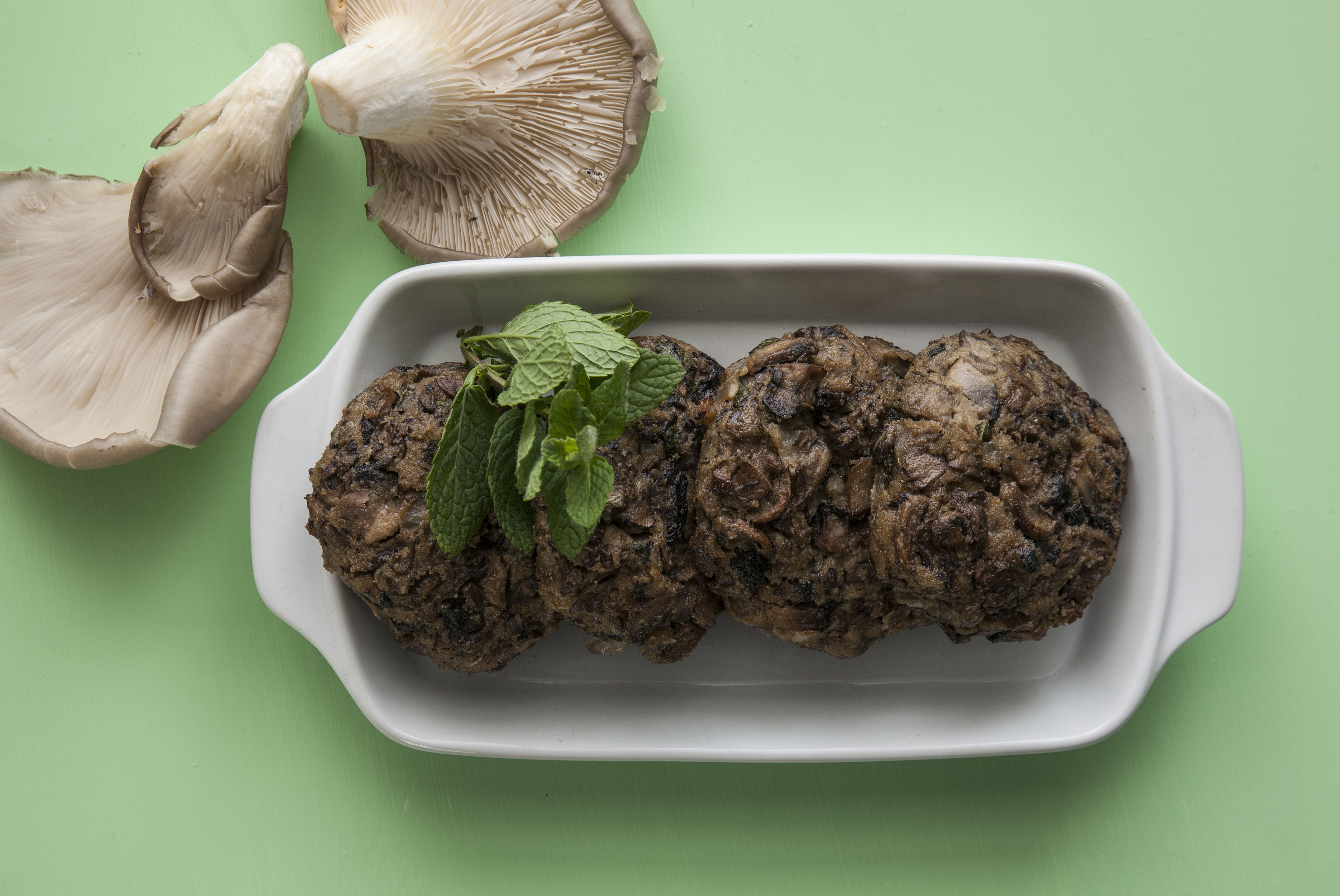 Κόβουμε τα μανιτάρια, το σκόρδο και το κρεμμύδι σε λεπτές φέτες και τα σοτάρουμε στα 100 ml ελαιόλαδο μέχρι να μαλακώσουν. Τα σβήνουμε με το μπράντι και αλατοπιπερώνουμε. Τα χτυπάμε στο μπλέντερ ελαφρά, να γίνουν ψιλοκομμένα. Τα αδειάζουμε σε ένα μπολ. Προσθέτουμε τον δυόσμο, το τυρί κρέμα, το κατίκι, τον κρόκο, το αλεύρι και ανακατεύουμε με τα χέρια, μέχρι να έχουμε ένα μείγμα που να πλάθεται. Το πλάθουμε σε μπιφτέκια μεγέθους της αρεσκείας μας. Τα τηγανίζουμε σε λίγο ελαιόλαδο, και από τις δύο πλευρές, μέχρι να ροδίσουν (περίπου 10 λεπτά συνολικά).