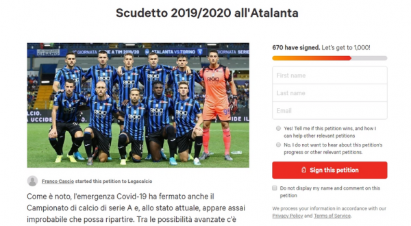 Συγκεκριμένα, το κίνημα «το πρωτάθλημα στην Αταλάντα» ζητά να δοθεί το φετινό πρωτάθλημα στην ομάδα του Μπέργκαμο, η οποία είναι η ευρωπαϊκή πόλη που έχει πληγεί περισσότερο από τον κοροναϊό.