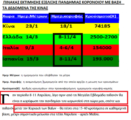 Κάτι αντίστοιχο συμβαίνει και στην Ιταλία και την Ισπανία όπου παρότι τα κρούσματα είναι της τάξης του 40-60% λιγότερα από αυτά προ μερικών ημερών, ο αριθμός νεκρών παραμένει μεγάλος. Οπως σημειωνόταν ακόμη στο ρεπορτάζ «με βάση αυτά τα δεδομένα ο χρόνος που θα παρουσιασθεί το σημείο κορύφωσης στην Ελλάδα (σσ. όπου τα περιοριστικά μέτρα ελήφθησαν στις 14 Μαρτίου) είναι περίπου μία έως τρεις ημέρες πριν από τη Μεγάλη Εβδομάδα κι ο χρόνος που θα γίνουν ελάχιστα τα κρούσματα είναι -με βάση όσα συνέβησαν στην Κίνα – στα τέλη Απριλίου. Ομως αυτός ο χρόνος αναμένεται να είναι μεγαλύτερος στην Ελλάδα επειδή δεν είχε την έκταση των μέτρων πλήρους «απονέκρωσης – ερημοποίησης» των πόλεων, που εφάρμοσε η κινεζική κυβέρνηση, ενώ ίσως υπάρξουν και ορισμένες άλλες διαφοροποιήσεις μικρής έκτασης. Κι αυτή λοιπόν η «εκμηδένιση» των κρουσμάτων υπολογίζεται στη χώρα μας εντός του Μαΐου. Οπως συμπληρωνόταν ακόμη η Ιταλία πιθανόν θα φτάσει στην κορύφωση του εφιάλτη το πρώτο πενθήμερο του Απριλίου και η Ισπανία το ίδιο χρονικό διάστημα με τη χώρα μας (σσ. πήρε τα μέτρα περιορισμού κυκλοφορίας στις 14-15 Μαρτίου όπως κι η Ελλάδα). Κάτι το οποίο επιβεβαιώθηκε από τα επιδημιολογικά δεδομένα των τελευταίων ημερών.