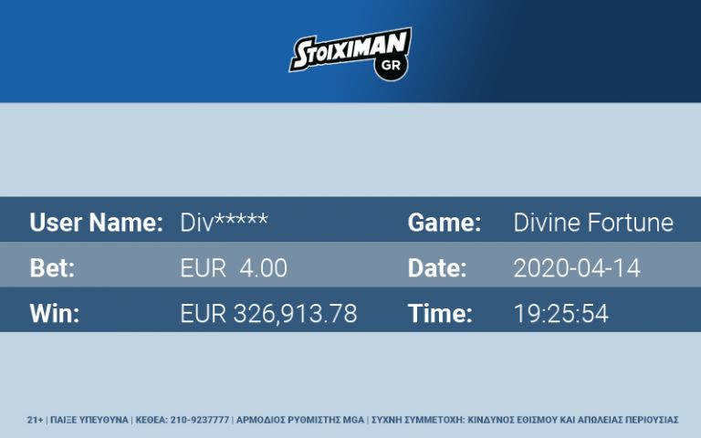 Απίστευτη τύχη είχε ένα μέλος του Stoiximan.gr το απόγευμα της Μεγάλης Τρίτης, καθώς τίναξε την μπάνκα στον αέρα στο Online Casino επιλέγοντας το φρουτάκι «Divine Fortune»..