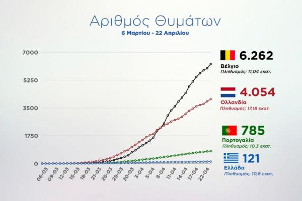 Σύμφωνα με τα διαγράμματα, έως χθες Τετάρτη 22 Απριλίου, η Ελλάδα είχε καταγράψει 121 θανάτους από τον κορωνοϊό, το Βέλγιο 6.262, η Ολλανδία 4.054 και η Πορτογαλία 785.