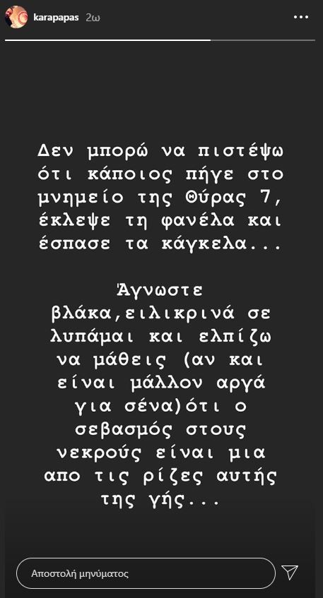 Αγνωστε, βλάκα, ειλικρινά σε λυπάμαι και ελπίζω να μάθει (αν και είναι μάλλον αργά για σένα) ότι ο σεβασμός στους νεκρούς είναι από τις ρίζες αυτής της γης…».