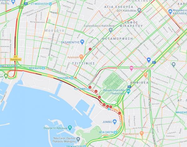 Το μποτιλιάρισμα ξεκινά από το Δέλτα Φαλήρου και συνεχίζει στην κάθοδο της Λεωφόρου Κηφισού φτάνοντας στο ύψος της Λαχαναγοράς.