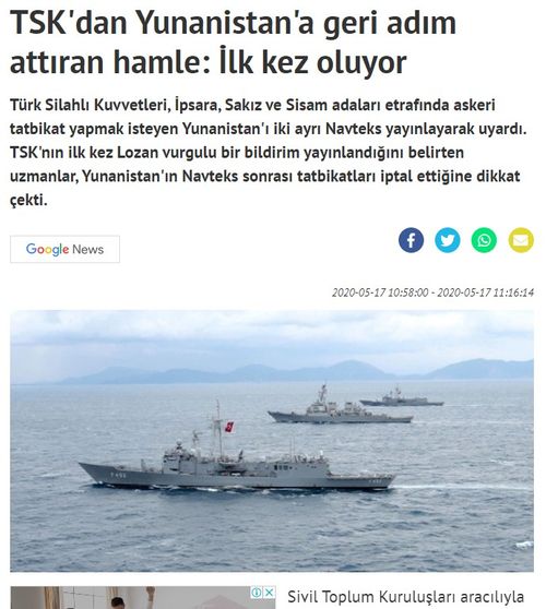 Μερίδα του φιλοκυβερνητικού τύπου πηγαίνει βέβαια και ένα βήμα παρακάτω, ισχυριζόμενη ότι η Ελλάδα ακύρωσε πρόσφατα την προγραμματισμένη στρατιωτική άσκηση σε Χίο και Σάμο με την πρόφαση της πανδημίας του κοροναϊού, αλλά στην πραγματικότητα υποχώρησε μετά την κίνηση των τουρκικών ενόπλων δυνάμεων.