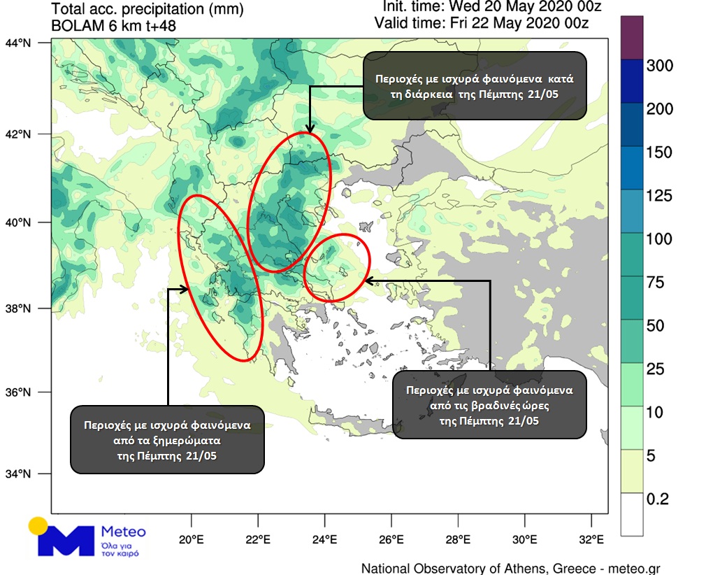 Κατά τη διάρκεια της Πέμπτης ισχυρές βροχές και καταιγίδες θα εκδηλωθούν σε μεγάλο μέρος της ηπειρωτικής χώρας, συμπεριλαμβανομένης της Θεσσαλονίκης, φαινόμενα που μέχρι το βράδυ της Πέμπτης θα επεκταθούν στην Εύβοια, στις Σποράδες και ενδεχομένως στη Βόρεια Αττική.