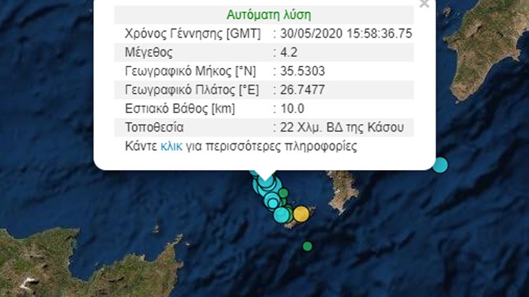 Σεισμική δόνηση 4,2 Ρίχτερ σημειώθηκε στην Κάσο, το Σάββατο, στις 17:58, σύμφωνα με το Γεωδυναμικό Ινστιτούτο Αθηνών.