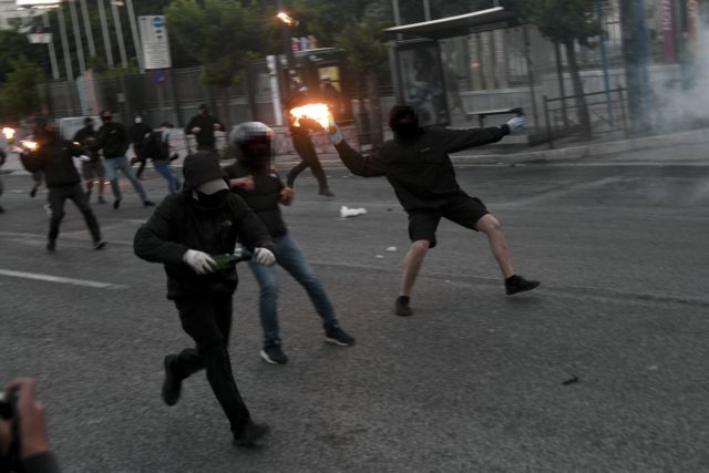 Σύμφωνα με την ΕΛΑΣ, διαδηλωτές επιτέθηκαν με μολότοφ, πέτρες και άλλα αντικείμενα σε αστυνομικές δυνάμεις που βρίσκονταν στο σημείο, ενώ έβαλαν φωτιά σε κάδους απορριμμάτων.
